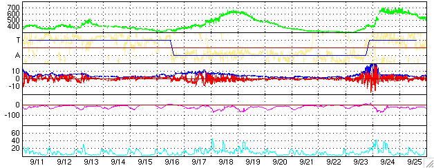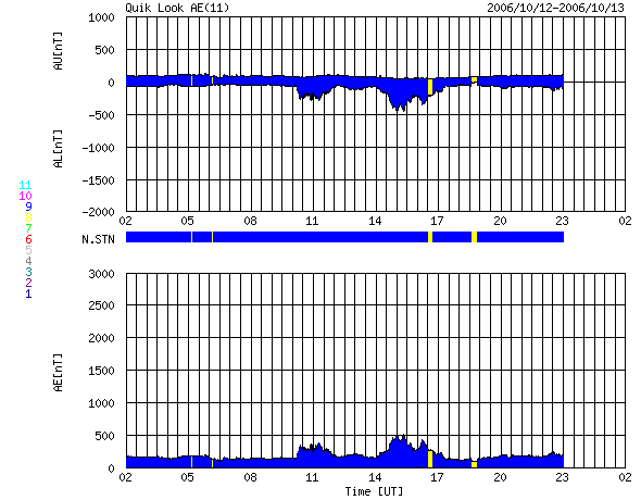 ACEが観測した太陽風の磁場(1番上の枠、白線は全体の強度、赤線は南北成分) および、太陽風の密度(3番目の橙線)、速度(4番目の黄線) (c) NOAA/SEC ![]() 沖縄の磁場擾乱 下へ下がるほど、擾乱が発達している事を意味します。 (c) NICT ![]() リアルタイムAE指数 下段のAEグラフの値が高くなると、オーロラ活動が活発化しています。 (c) 京都大学, NICT ![]() シベリアで観測された3日間の磁場データ 右側の3分の1が、昨日のデータになります。グラフが上がったり下がったりすると、オーロラ活動が活発化しています。 (c) NICT ![]() GOES衛星の太陽X線データ (c) NOAA/SEC ![]() 27日の太陽周期に合わせたデータプロット (太陽風版) 太陽が同じ面を地球に向けていた27日前の変化から、今後を予想することができます。 (c) NICT