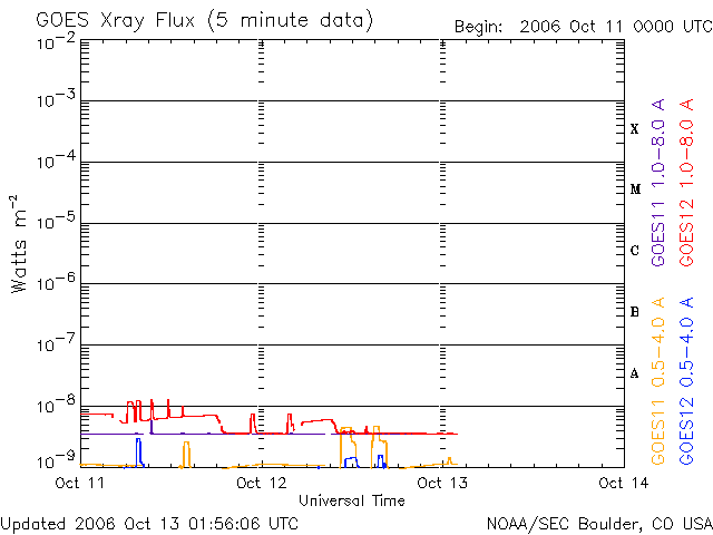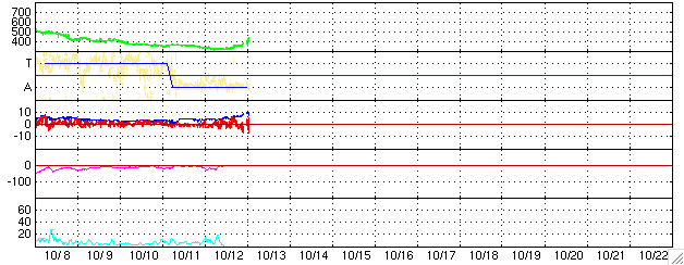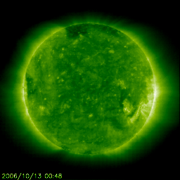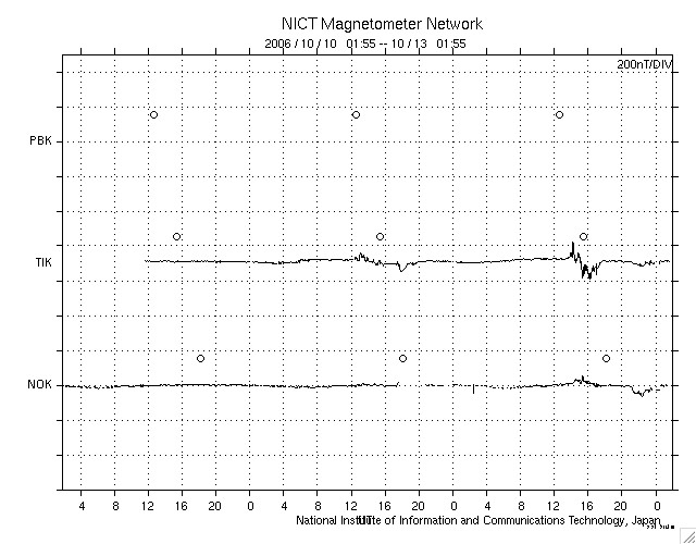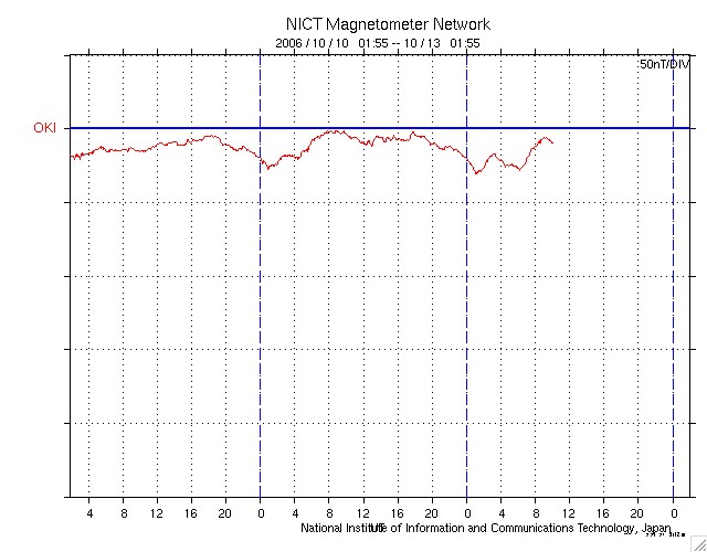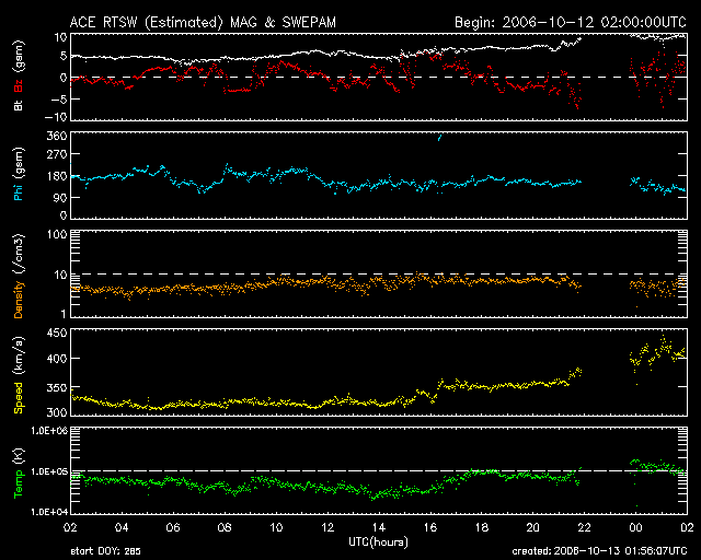 2006/10/13 10:58 更新 太陽風速度が上昇傾向に転じました。磁気圏は今のところ静穏です。 担当 北村 太陽風速度が上昇に転じて、現在400-450km/秒程度まで上昇しています。 このあともしばらく上昇傾向が続きそうです。 太陽風磁場も増大を始めて、南北成分(赤い線)は南向きを示しています。 沖縄磁場変動を見る限りでは、現在のところ磁気圏は静穏ですが、 一般に、太陽風磁場の南北成分が-10nT以下を数時間以上継続すると、 磁気嵐発生の恐れが強まります。今後の推移に注目が必要です。 AE指数やシベリア磁場データを見ると、オーロラの活動は現在のところ静穏で、 15時UTあたりに弱いオーロラの活動が見られる程度ですが、こちらも、 今後の太陽風の変化によって荒れる可能性があります。 SOHO EIT195の画像では、コロナホールが西(向かって右)に見えていますが、 それ以外の擾乱要因(明るい活動領域等)は見られず、GOESのX線のグラフでも フレアーの発生は見られません。 ここ数日は、太陽風の変動に注意が必要です。 SOHO衛星のEIT195カメラの映像 (c) SOHO (ESA & NASA)