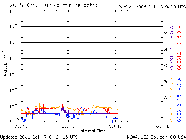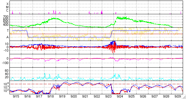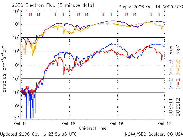 下段のAEグラフの値が高くなると、オーロラ活動が活発化しています。 (c) 京都大学, NICT ![]() GOES衛星による、静止衛星軌道における高エネルギー電子の変化 (c) NOAA/SEC ![]() SOHO衛星のMDIカメラによる太陽黒点 (c) SOHO (ESA & NASA) ![]() GOES衛星の太陽X線データ (c) NOAA/SEC ![]() | |||||||||||||||||||||||||||||||||||||||||||||||||||||||||||||