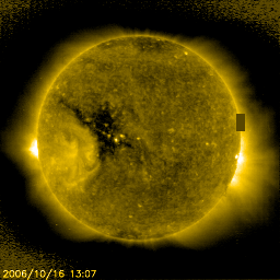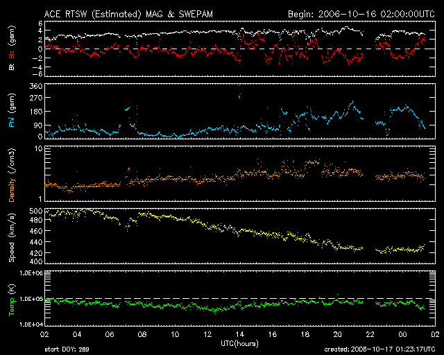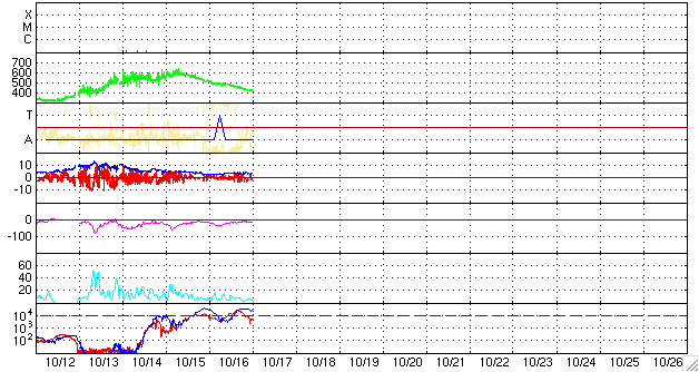 2006/10/17 10:25 更新 太陽風の速度は下がり(420km/秒)、地球は高速風領域を抜け出しました。放射線帯高エネルギー電子は強まった状態が続いています。 担当 篠原 太陽風の速度はどんどん下がり、500km/秒から420km/秒に下がりました。 通常の速度に戻ったと言えます。 27日周期の図より、高速風の変化を前周期(9月17日〜20日)と比較すると、 継続期間がやや広がり、地球への到来のタイミングが1日ほど早まっています。 速度が低下に向かっていますが、太陽風磁場の南北成分は-2nTくらいの弱い南向きが発生しています。 このため、小規模のオーロラ活動は継続している様です。 AE指数のグラフを見ると、あまり明瞭ではありませんが、 300〜500nTくらいの変化が比較的連続的に発生しているようです。 南向きの振幅が小さいことと、速度が下がっているため、小さな活動にとどまっています。 27日周期の図から、今後の変化を予想してみましょう(図の時刻は世界時です)。 前周期は9月20日に太陽風の速度(緑色線)が下がり、 21日から23日前半にかけて低速風が続いています。 23日に入ったところで、磁場強度(青線)が強まり始め、 23日の後半から速度が上昇を開始しています。 24日に入ると太陽風の速度は650km/秒に達し、かなりの高速状態になりました。 南向き磁場(赤線のマイナス変化)が強まったため、オーロラ活動が活発になり(24日の水色線の増加)、 小規模の磁気嵐も発生しています(24日の桃色線の減少)。 高速風の発生源のコロナホールは、SOHO EIT284の2枚目の写真(9月19日)で見ることができます。 太陽の中心からやや東寄り(左寄り)に暗い穴が見えています。 ここがコロナホールです。 これを最新の写真(EIT284の1枚目)と比較してください。 コロナホールはほぼ同じ位置にあり、やや濃く、大きくなっているように感じます。 位置に大きな変化がないことから、前周期と同様の変化がこのあと見られると予想できます。 日付を今周期に変換すると、今日から19日にかけて穏やかな太陽風が続きます。 20日になると磁場強度に変化が始まり、これを前触れとする様に、速度の上昇が始まるでしょう。 日本時間では21日に入っているかもしれません。 高速風の規模は前周期と同様か、コロナホールが拡大している印象から、 やや強まっているかもしれません。 特に20日から21日にかけては、オーロラ観望も期待できます。 放射線帯の高エネルギー電子の強まった状態が続いています。 GOES12(赤線)では、密度がやや増加しています。 衛星運用では支障が発生しやすい状態が続いていますので、注意が必要です。 今後の太陽風の変化を考えると、次の高速風が来る21日くらいまで警戒状態が続くと予想されます。 27日周期の図で、前周期の変化を参考にしてください。 この時も、9月19日に増加した高エネルギー電子は、23日の擾乱が始まるまで高いレベルを続けていました。 太陽は引き続き無黒点です。 X線のグラフは最低レベルを続けていて、非常に穏やかです。 SOHO衛星のEIT284カメラの映像 (c) SOHO (ESA & NASA)