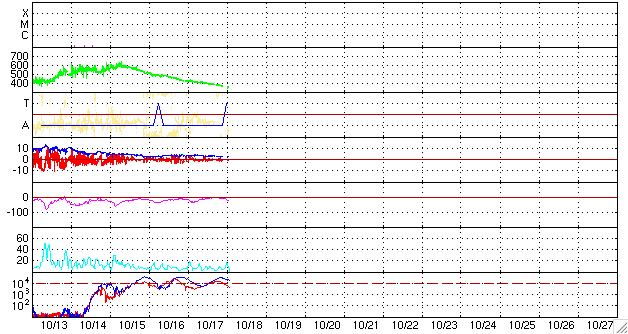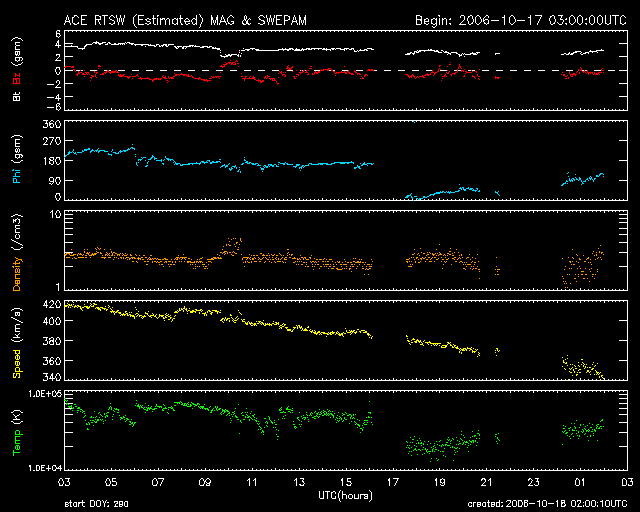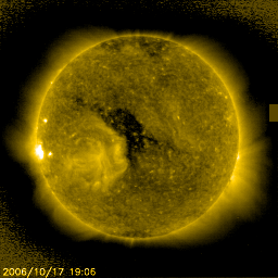 2006/10/18 11:02 更新 太陽風は低速となり(350km/秒)、オーロラ活動も穏やかです。放射線帯高エネルギー電子は高いレベルを保っています。 担当 篠原 太陽風は引き続き速度が低下しています。 400km/秒を切り、350km/秒まで下がりました。 磁場強度も3nTと弱まっていて、穏やかな太陽風になっています。 オーロラ活動も概ね静穏で、AE指数は目立った変化をしていません。 図の中央部に小さな変化が見えていますが、 これは、太陽風磁場の南北成分が小さいながらも南寄り(マイナス)の傾向 を持っていることによるのかもしれません。 小さいながらも、エネルギ−の流れ込みがあり、 弱いオーロラ活動を作っていた可能性があります。 昨日のニュースで詳しく述べましたが、これから20日にかけて、 太陽風は現状のまま穏やかに推移すると予想されます。 そして、20日の後半か、21日に入った頃から速度の上昇が始まるでしょう。 発生源となるコロナホールが、太陽の中心に達しています。 SOHO EIT284の写真をごらん下さい。 放射線帯の高エネルギー電子は、高レベルのまま安定しています。 増加は止まりましたが、GOES11,12ともに10の4乗の線を超えています。 引き続き、衛星の運用には注意が必要です。 太陽は無黒点のままです。 X線強度も低く、とても穏やかな状態が続いています。 SOHO衛星のEIT284カメラの映像 (c) SOHO (ESA & NASA)