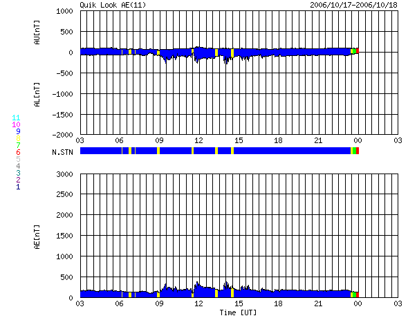 ACEが観測した太陽風の磁場(1番上の枠、白線は全体の強度、赤線は南北成分) および、太陽風の密度(3番目の橙線)、速度(4番目の黄線) (c) NOAA/SEC ![]() リアルタイムAE指数 下段のAEグラフの値が高くなると、オーロラ活動が活発化しています。 (c) 京都大学, NICT ![]() 27日の太陽周期に合わせたデータプロット 太陽が同じ面を地球に向けていた27日前の変化から、今後を予想することができます。 (c) NICT