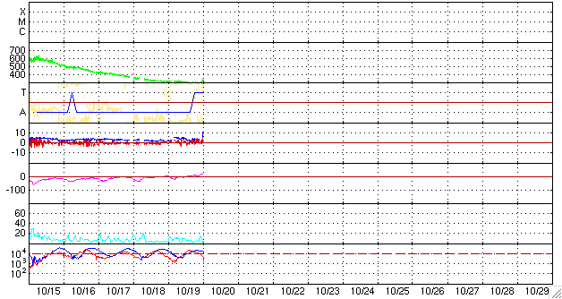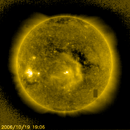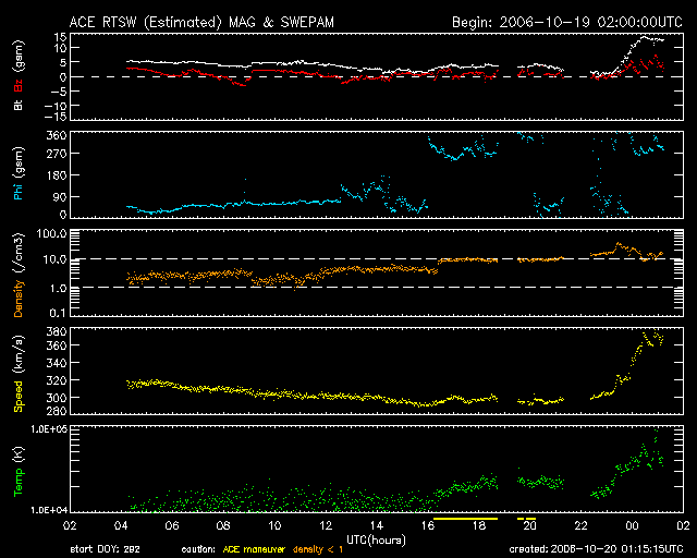 2006/10/20 10:17 更新 コロナホールによる高速風が始まりつつある様です。太陽風の磁場強度が強まり、速度もやや上がっています。 担当 篠原 太陽風の乱れが始まりつつある様です。 ACE衛星の観測によると、今朝、20日8時(世界時19日23時)頃から 太陽風磁場の強度が2nTくらいから一気に13nTへ強まっています。 また、半日ほど先立って、太陽風の粒子密度も2個/ccくらいから10個/ccへと増えています。 これらの変化は、高速風領域の始まりによく見られる変化です。 太陽風の速度も300km/秒から370km/秒へ増加しています。 まだ変化としては小さく、値としても、低速から通常レベルに戻った程度です。 この後も、増加し続けるのではないでしょうか。 その場合は、高速風領域の始まりです。 太陽風磁場が強まったことで、磁気圏活動が活発になる可能性がでてきました。 今のところ、南北成分の強さはまだ5nTくらいで、 かつ、北を向いていますので、現時点ではたいした影響は現れていません。 しかし、今後、南北成分が強まり、南を向くようになると、 磁気圏が一気に活動的になります。 本格的に高速風領域に入り、速度が高まって来ると、 それにつれて磁気圏への影響も次第に大きくなります。 磁気嵐が発生したり、オーロラが活発になる可能性があります。 27日周期の図を見ると、変化の始まりは前周期よりも半日か1日ほど早まっているようです。 セクターの切り替わりも1日ほど早くなっています。 この程度の変化は特にめずらしいことではありません。 放射線帯の高エネルギー電子は、高いレベルを保っています。 GOESの両衛星で、警戒ラインの10の4乗を超えたままです。 もうしばらく注意が必要でしょう。 高速風が始まって、磁気圏へ影響が及び始めると一気に減りますので、 明日はもうレベルが下がっている可能性があります。 太陽は無黒点のままです。 X線のグラフも非常に低レベルになっています。 とても静穏です。 いよいよ、極小期の底を打ちつつあるように思います。 SOHO衛星のEIT284カメラの映像 (c) SOHO (ESA & NASA)