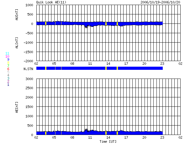 ACEが観測した太陽風の磁場(1番上の枠、白線は全体の強度、赤線は南北成分) および、太陽風の密度(3番目の橙線)、速度(4番目の黄線) (c) NOAA/SEC ![]() リアルタイムAE指数 下段のAEグラフの値が高くなると、オーロラ活動が活発化しています。 (c) 京都大学, NICT ![]() 27日の太陽周期に合わせたデータプロット 太陽が同じ面を地球に向けていた27日前の変化から、今後を予想することができます。 (c) NICT
