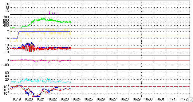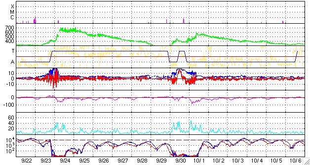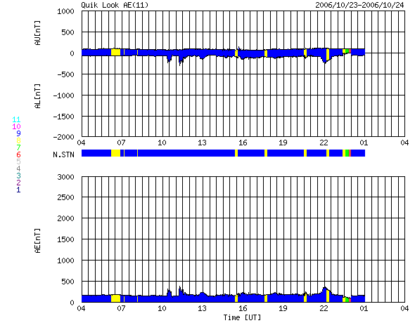 ACEが観測した太陽風の磁場(1番上の枠、白線は全体の強度、赤線は南北成分) および、太陽風の密度(3番目の橙線)、速度(4番目の黄線) (c) NOAA/SEC ![]() リアルタイムAE指数 下段のAEグラフの値が高くなると、オーロラ活動が活発化しています。 (c) 京都大学, NICT ![]() 27日の太陽周期に合わせたデータプロット 太陽が同じ面を地球に向けていた27日前の変化から、今後を予想することができます。 (c) NICT