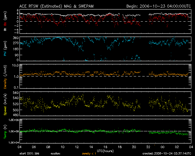 2006/10/24 12:40 更新 太陽風は高速状態が続いています(520km/秒)。磁場が北寄りなので、磁気圏は静穏です。 担当 篠原 太陽風は、やや高速の状態で安定してます。 ACE衛星の観測によると、速度は昨日より520km/秒前後の状態が続いています。 27日周期の緑色線で、前回(9月24-27日)と、今回(10月20-23日)の 高速風の形を比べてみてください。 前回は、速度が上がった後は、一定のペースでどんどん下がっていますが、 今回は、下がりかけたところで持ちこたえています。 太陽風の吹き出し方が微妙に変化しているのでしょう。 磁場強度は4nTとほぼ変わらず、 南北成分(ACEの赤線)は北寄り(プラス)のなかで細かく振動しています。 このため、磁気圏への影響はとても小さくなっています。 速度はまだ高いのですが、南向き(マイナス)が見られないため、 オーロラ活動はとても穏やかです。 AE指数には小さな変化がちらほら見える程度で、静穏な状態です。 高速風は、この後再び速度の低下が始まるでしょう。 そして、明日くらいで下がりきって、穏やかになると思います。 続いて、27日くらいから次の高速風がやってきます。 発生源のコロナホールが、SOHO EIT284の写真に見えています。 やや南寄りですが、中央線を過ぎて、 今、地球へ向かって高速風が吹き出しているところです。 前周期は、550km/秒くらいで、高速状態は2日ほどでした。 高速風としては小規模でしたが、南向き磁場の関係で、 わりと活発なオーロラ活動を起こしました。 今回はどうなるでしょうか。 放射線帯の高エネルギー電子は、増加が止まっています。 10の4乗の線には達せず、やや高めのレベルです。 高速風も終盤に来ていますので、今回は大きく増加するといことはないようです。 太陽のフレア活動は静穏です。 917黒点群はほとんど活動を起こしていません。 また、917黒点群の向こう側に918黒点群というのができているそうですが、 掲載している写真ではよく分かりません。 小さい群ですので、影響はないでしょう。 また、SOHO LASCO C3の写真で、CME(太陽ガスの放出現象)が写っていますが、 太陽の反対側の現象によると思われます。 地球への影響はありません。 SOHO衛星のEIT284カメラの映像 (c) SOHO (ESA & NASA)