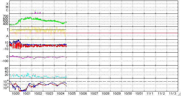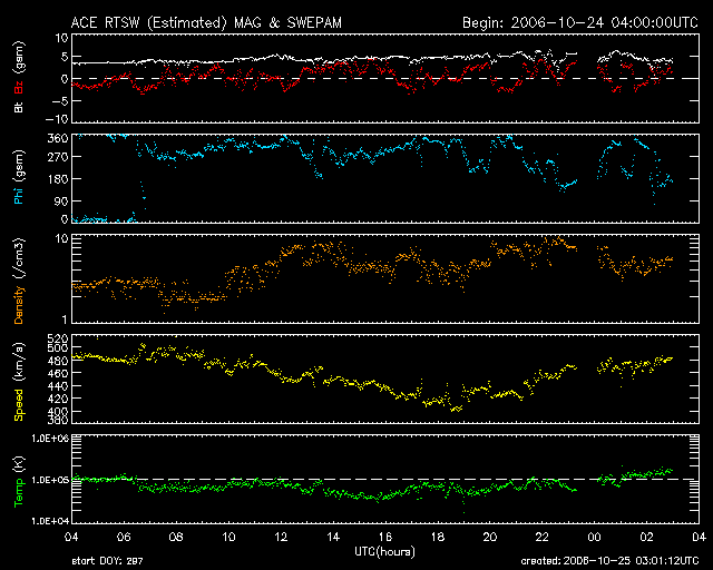 2006/10/24 12:40 太陽風は高速状態が続いています(520km/秒)。磁場が北寄りなので、磁気圏は静穏です。