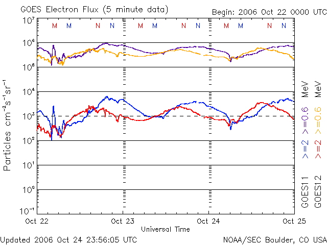 2006/10/21 11:43 高速太陽風が始まりました(600km/秒)。オーロラもやや活動的です。放射線帯の高エネルギー電子は減少しています。