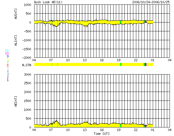 AE指数でオーロラの活動度を見ると、小さな変化が時々見えている程度です。