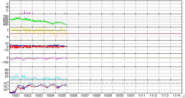 25日16時(世界時25日7時)のところに400nTくらいの小さな山が見えているくらいで、