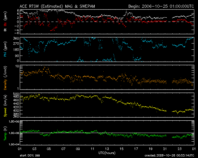 2006/10/25 12:04 太陽風はやや高速です(480km/秒)。磁気圏は概ね静穏です。