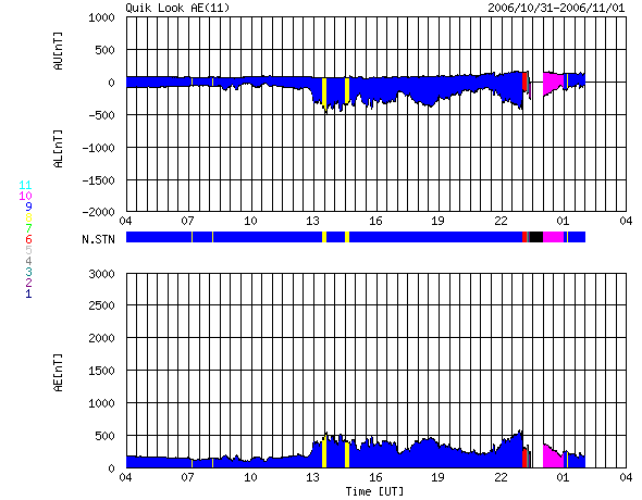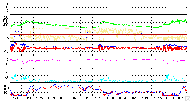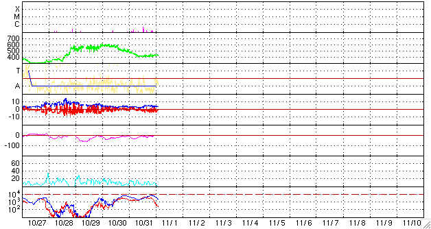 ACEが観測した太陽風の磁場(1番上の枠、白線は全体の強度、赤線は南北成分) および、太陽風の密度(3番目の橙線)、速度(4番目の黄線) (c) NOAA/SEC ![]() リアルタイムAE指数 下段のAEグラフの値が高くなると、オーロラ活動が活発化しています。 (c) 京都大学, NICT ![]() 27日の太陽周期に合わせたデータプロット 太陽が同じ面を地球に向けていた27日前の変化から、今後を予想することができます。 (c) NICT