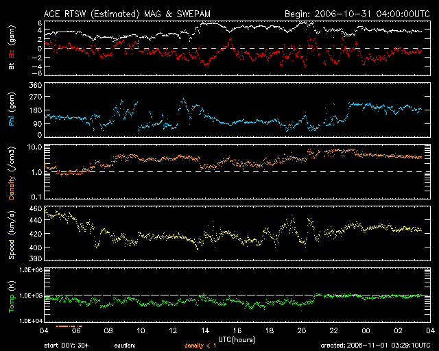 2006/11/ 1 12:32 更新 太陽風は通常の速度にもどっています(420km/秒)。921黒点群がやや大きくなっています。 担当 篠原 ACE衛星の観測によると、太陽風は昨日のニュースの後、 31日16時(世界時31日7時)頃に速度が420km/秒まで下がりました。 その後はほぼ安定した状態で、現在まで来ています。 太陽風の磁場は4nTで普段の強度を保っています。 ただ、南北成分がやや強まって、-2〜-4nTの南寄りの状態が半日ほど続きました。 その影響で、オーロラの活動もある程度強まっています。 AE指数で500nTくらいの中規模の変動が、 磁場の南寄りと対応するように、半日ほど続いています。 ここでは、磁場が南向きと言っても、それほどの振幅ではないこと、 速度が通常レベルに下がっていることなどの理由で、 比較的小規模のオーロラ活動に留まっていたのでしょう。 ACEの図の最後の部分を見ると、南北成分が弱まって、南寄りの傾向も一旦終わっています。 このまま南北成分が小さくなったままで推移すると、磁気圏も穏やかになって行きます。 南寄りが再び強まるようでしたら、オーロラ活動も中小規模のものが続くでしょう。 いずれにしても、現時点では太陽風が大きく乱れる要素はなく、 基本的には穏やかな状態が明後日くらいまで続くと思われます。 明後日の11月3日か、4日に入った頃から、次の乱れがやってくる可能性があります。 27日周期の図の、10月7-8日に見えている変動の回帰です。 SOHO EIT284の太陽写真で、太陽の北極(一番上)から中心付近にかけて、 南北(上下)に黒い筋が見えています。 あまりはっきりしたものではありませんが、 乱れが到来した場合は、このコロナホールが関係すると思われます。 放射線帯の高エネルギー電子は、それほど増加せず、 昨日の、警戒ラインのやや下というレベルに留まっています。 今回はこれ以上増加することはないでしょう。 太陽では、921黒点群の規模が大きくなっています。 黒点の数も増えていますし、エネルギーを示す磁場構造の複雑さも増しているようです。 この後、小規模のフレアくらいは起こすかもしれません。 この様な、黒点群の活動の程度を調べるには、GOESのX線動画を見るのが一番なのですが、 9月以来、GOES12のX線カメラに障害が発生していて、 動画として太陽の状況を見ることができません。 残念な状態です。 黒点群としては、921群の左下にもうひとつ922群が出現しています。 こちらは、小さな点がひとつ見えている程度です。 SOHO衛星のEIT284カメラの映像 (c) SOHO (ESA & NASA)