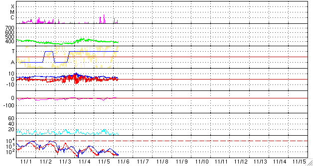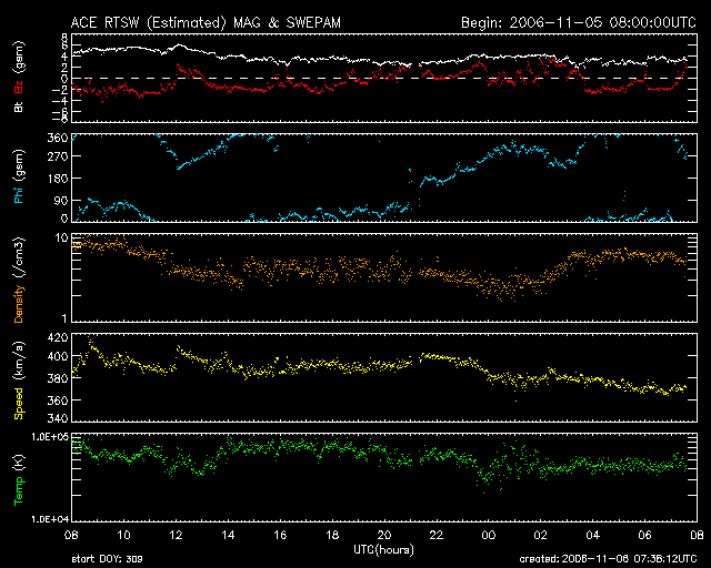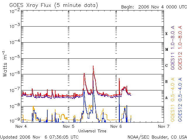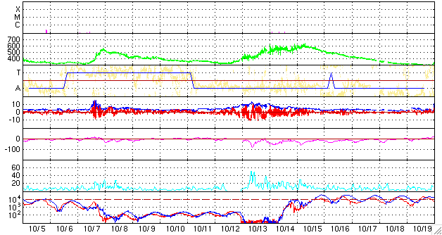 2006/11/ 6 16:42 更新 921黒点群で、小規模フレアが2回発生しています。 担当 篠原 太陽で小規模フレアが2回発生しています。 太陽の中心やや西(右)寄りに見ている921黒点群が、 昨日、5日16時(世界時5日7時)にC1.3、 5日21時(世界時5日12時)にC3.7の小規模フレアを起こしました。 太陽では、今日に入ってもBクラスの小さなフレアが2回起こっています。 921黒点群は規模を保っていますので、 引き続き、現状程度のフレア活動が続く可能性があります。 昨日のニュースでは、太陽は穏やかでしょうと書きましたが、 そのすぐ後にフレアが起こりました。 太陽の活動度は、GOESのX線動画を見ているとよくわかります。 しかし、9月以降GOES12のX線のデータが停止しているため、 動画を見る事ができず、細かい雰囲気が分からなくなっているのです。 宇宙天気の分析では困った状態が続いています。 太陽風は400km/秒の通常の速度が安定して続いていました。 図の最後の部分で370km/秒にやや下がっていて、これから更に下がって行く可能性があります。 太陽風磁場は3〜4nTでやや弱めです。 -2nTくらいの南向きが続いている時間帯があります。 極域では、小さめのオーロラ活動が起こっていた様です。 シベリアの磁場データで200nTくらいの弱い変動が記録されています。 (AE指数は停止しています) 明後日くらいまで、太陽風、磁気圏は比較的穏やかな状態が続くでしょう。 9日くらいから次の高速太陽風がやってくると予想されます。 その原因となるコロナホールが、太陽の中心に見えています。 GOES-13のX線写真を掲載しています。 GOES-13は、まだ本運用には入っていない様で、写真では太陽が左側に傾いています。 頭を30度ほど左に傾けて写真を見てください。 (出張先から更新していますので、写真を補正することができませんでした) ちょうど中心を越えたくらいですので、今吹き出した高速風が、3日くらいで地球にやってきます。 GOES衛星のX線カメラで撮影した太陽の様子。6日16時 (世界時6日7時)。 (c) NOAA/SEC GOES衛星の太陽X線データ (c) NOAA/SEC ![]() SOHO衛星のMDIカメラによる太陽黒点 (c) SOHO (ESA & NASA) ![]() ACEが観測した太陽風の磁場(1番上の枠、白線は全体の強度、赤線は南北成分) および、太陽風の密度(3番目の橙線)、速度(4番目の黄線) (c) NOAA/SEC ![]() シベリアで観測された3日間の磁場データ 右側の3分の1が、昨日のデータになります。グラフが上がったり下がったりすると、オーロラ活動が活発化しています。 (c) NICT ![]() 27日の太陽周期に合わせたデータプロット 太陽が同じ面を地球に向けていた27日前の変化から、今後を予想することができます。 (c) NICT