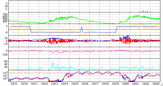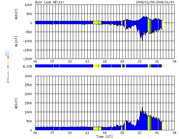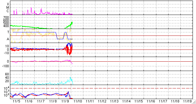 ACEが観測した太陽風の磁場(1番上の枠、白線は全体の強度、赤線は南北成分) および、太陽風の密度(3番目の橙線)、速度(4番目の黄線) (c) NOAA/SEC ![]() リアルタイムAE指数 下段のAEグラフの値が高くなると、オーロラ活動が活発化しています。 (c) 京都大学, NICT ![]() シベリアで観測された3日間の磁場データ 右側の3分の1が、昨日のデータになります。グラフが上がったり下がったりすると、オーロラ活動が活発化しています。 (c) NICT ![]() 沖縄の磁場擾乱 下へ下がるほど、擾乱が発達している事を意味します。 (c) NICT ![]() 27日の太陽周期に合わせたデータプロット 太陽が同じ面を地球に向けていた27日前の変化から、今後を予想することができます。 (c) NICT