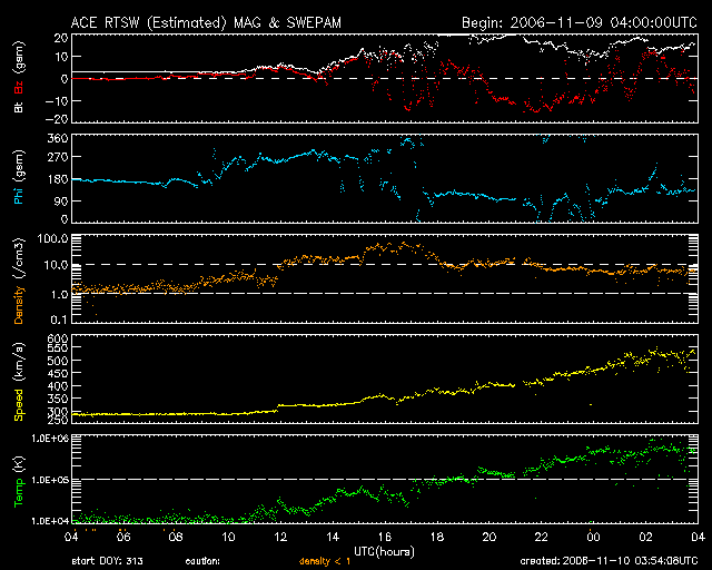 2006/11/10 12:55 更新 高速太陽風がやってきました。速度は500km/秒を超えています。磁気圏の活動も活発に発生しています。 担当 篠原 高速太陽風がいよいよやってきました。 9日21時(世界時9日12時)に、太陽風の密度(ACEの橙色線)と速度(黄色線)に飛びが発生していますが、 そこから速度がゆっくりと上昇を始めています。 それまで300km/秒を切るくらいに低速になっていたのですが、 半日ほどを経過して、現在は520km/秒に達しています。 太陽風の磁場強度も、速度の飛びと同じ頃から強まり始め、 10日3時(世界時9日18時)には20nTにまで強まりました。 かなりの強度です。 この状態は4時間ほど続き、現在は10nTから15nTの間で大きく変化しています。 磁場強度としては、依然大きな値です。 磁気圏への影響を決定する、太陽風磁場の南北成分は、 磁場の強まりとともに、南を大きく向く傾向が続いていました。 ACEの図を見ると、8時間ほどの間、 最大で-15nTに達するほどの大きな南向きの傾向が続いています。 このため、磁気圏はかなり活動的になりました。 オーロラの活動度を示すAE指数は、1000nTを超える大きな変動が記録されています。 また、磁気嵐も発生しているようです。 沖縄の磁場データでは、最大になった値から-70nTほど一気に下がっています。 世界的な観測でも、磁場強度が-100nTほど下がっていて、 中規模の磁気嵐になっている様です。 ただし、ここまでの変動は、磁場がかなり大きく南を向いたほどには、 激しい変化になっていません。 その理由は、磁場が南を向いた頃の太陽風の速度がまだ遅めで、 350〜450km/秒ほどしかなかったためです。 磁気圏へのエネルギーの流れ込みは、速度と南向きの磁場の強さの両方に影響されるのです。 さて、磁場強度は依然強いままですので、 高速風は、まだ最高速度に達していない可能性があります。 27日周期の図で、前回の速度変化を見ると(10月14-15日)、 速度はゆっくりと上がり続け、後半で600km/秒に達するという変化をしています。 今回も同様にとは言えませんが、磁場強度が弱まるまでは注意が必要です。 速度が上がって来ると、磁場が南を向いた時に、磁気圏の乱れ方も激しくなります。 現在はやや北寄りになっていて、磁気圏活動も一段落となっていると思いますが、 今後の変化に注目する必要があります。 高速風は3日くらい続くと予想されます。 放射線帯の高エネルギー電子は、磁気圏の乱れにともなって、 大きく減少しています。 しかし、今後、増加に転じると思われますので、明日以降の変化に注意してください。 太陽では、923黒点群が、姿を現した後はおとなしくなっていて、 目立った活動を起こしていません。 X線のグラフも基本的に静かです。 923黒点群は黒点の規模は大きいのですが、エネルギーを示す磁場構造の複雑さはそれほどでもありません。 注目していただけに、やや拍子抜けの印象です。 太陽面の向こう側でエネルギーを使い果たしてしまったのでしょうか。 しかし、しばらく休んだ後に、再び活動的になることもありますので、 当面注目しておく必要はあるでしょう。 SOHO衛星のEIT284カメラの映像 (c) SOHO (ESA & NASA)