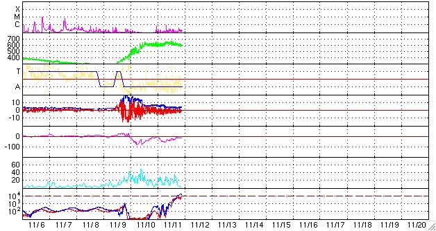 2006/11/10 12:55 高速太陽風がやってきました。速度は500km/秒を超えています。磁気圏の活動も活発に発生しています。