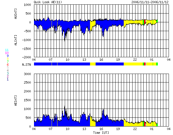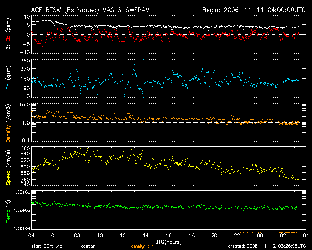 2006/11/11 07:06 太陽風はかなり高速になっています(600km/秒)。激しいオーロラ活動が起こっています。