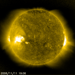 2006/11/ 8 10:42 太陽の東端で活発なフレア活動が続いています。明日以降、回帰性の高速太陽風がやってきます。