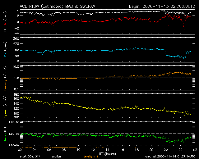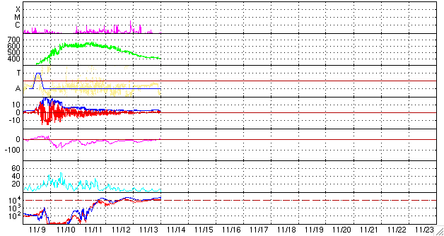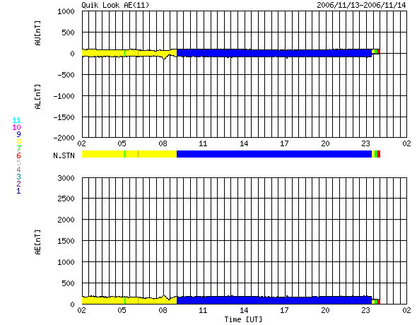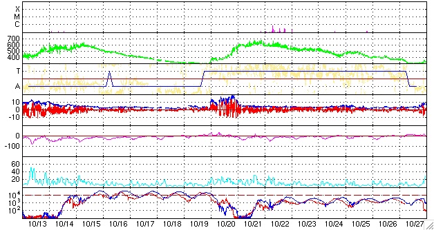 SOHO衛星のMDIカメラによる太陽黒点 (c) SOHO (ESA & NASA) ![]() GOES衛星の太陽X線データ (c) NOAA/SEC ![]() ACEが観測した太陽風の磁場(1番上の枠、白線は全体の強度、赤線は南北成分) および、太陽風の密度(3番目の橙線)、速度(4番目の黄線) (c) NOAA/SEC ![]() リアルタイムAE指数 下段のAEグラフの値が高くなると、オーロラ活動が活発化しています。 (c) 京都大学, NICT ![]() 27日の太陽周期に合わせたデータプロット 太陽が同じ面を地球に向けていた27日前の変化から、今後を予想することができます。 (c) NICT