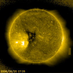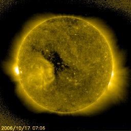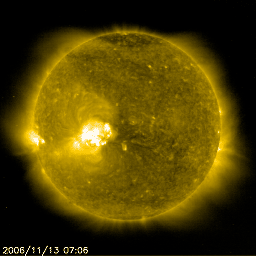 2006/11/14 10:28 更新 太陽風は通常の速度に戻りました(400km/秒)。放射線帯の高エネルギー電子は高いレベルで安定しています。 担当 篠原 太陽では、923黒点群が中心近くで大きな姿を見せています。 このくらい大きいと、肉眼でも見えるかもしれません。 適切な遮光板を使うか、日没直前の暗くなった太陽で挑戦してみてはいかがでしょうか。 (くれぐれも減光に注意してください) この923黒点群でCクラスの小規模フレアが続きましたが、 昨日は13日15時半(世界時13日6時半)にC1の小さなフレアを起こしただけで、 活動は落ち着きつつあるようです。 X線のグラフで見ても、小刻みな変化が減っています。 ただし、黒点群の規模は大きいので、小規模フレアが発生する可能性は十分あると思います。 また、太陽の東端(左端)に新しい黒点群が見えています。 まだ番号が付いていませんが、924黒点群です。 太陽風はどんどん速度を落としています。 昨日の460km/秒から、現在は400km/秒まで下がりました。 穏やかな太陽風に戻ったといってよいでしょう。 磁場強度は3nTとやや弱く、南北成分も0nTからやや北寄りに推移していて、 地球磁気圏への影響はとても小さくなっています。 オーロラの活動度を示すAE指数のグラフには全く変化が無く、 オーロラ活動がとても穏やかだったことを示しています。 27日周期の図を見ると、前周期の10月20日から高速の太陽風がやって来ています。 この乱れはずいぶん前から、ずっとここで安定して発生していました。 発生源となるコロナホールもなかなか立派で、 参考のため、過去2周期(10月17日、9月20日)のSOHO EIT284画像を掲載します。 ところが、今周期は太陽の様子が変わっています。 923黒点群の発達の影響か、このコロナホールがすっかり姿を消しているのです。 SOHO EIT284の左端の写真と、他の2枚の写真を比べてください。 コロナホールが見えなくなっています。 この影響が今周期の太陽風にどのように現れるのか、16日以降の変動が注目されます。 発達した活動領域の明るいガスに隠れているだけで、 吹き出しの構造は残っているのかもしれません。 あるいは、太陽風の吹き出し自体が弱まってしまっているのでしょうか。 放射線帯の高エネルギー電子は、増加はほぼ止まりましたが、 たいへん高いレベルが続いています。 衛星の運用では注意が必要な状況です。 SOHO衛星のEIT284カメラの映像 (c) SOHO (ESA & NASA)