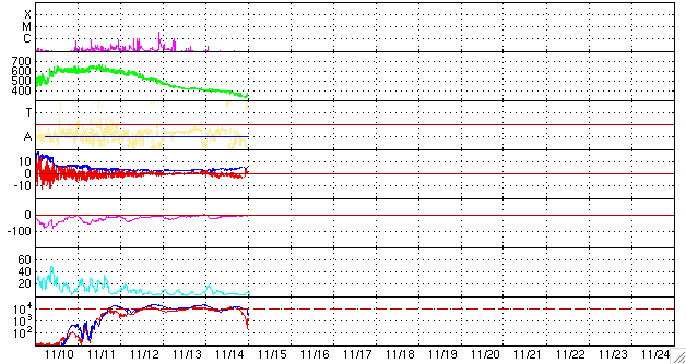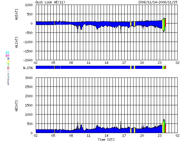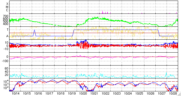 ACEが観測した太陽風の磁場(1番上の枠、白線は全体の強度、赤線は南北成分) および、太陽風の密度(3番目の橙線)、速度(4番目の黄線) (c) NOAA/SEC ![]() リアルタイムAE指数 下段のAEグラフの値が高くなると、オーロラ活動が活発化しています。 (c) 京都大学, NICT ![]() 27日の太陽周期に合わせたデータプロット 太陽が同じ面を地球に向けていた27日前の変化から、今後を予想することができます。 (c) NICT