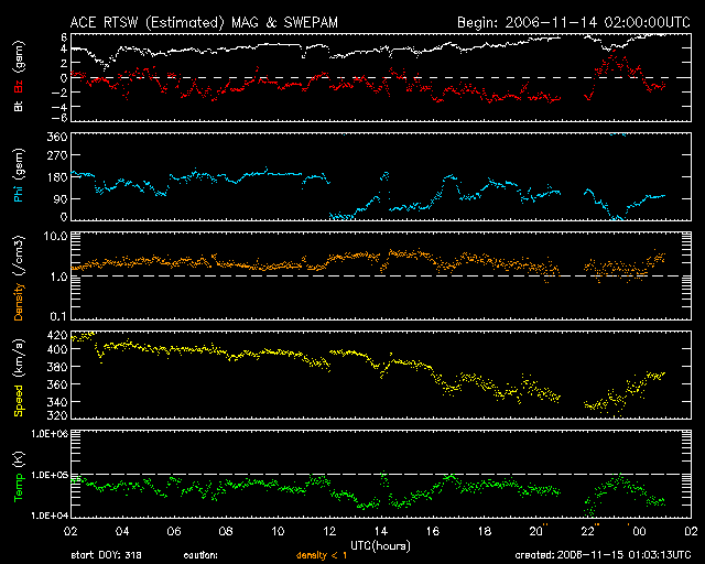 2006/11/15 10:03 更新 太陽風の速度はやや遅くなっています。南向き磁場の影響で、小規模のオーロラ活動が続いています。 担当 篠原 太陽風はゆっくりと速度が下がって、 400km/秒から15日7時(世界時14日22時)に340km/秒まで落ちました。 その後反転して、3時間後の現在(15日10時、世界時15日1時)370km/秒へやや上がっています。 太陽風の磁場強度を見ると、4nTがずっと続いていたのですが、 速度が落ちきる頃からやや強まり始め、現在は6nTを超えつつあります。 速度がやや上がっていることと関係しているのかもしれません。 その場合は、もうしばらく速度の上昇が続く可能性があります。 27日周期で考えると、次の高速風の始まりの予想よりも1日早く、 今見えている変化が、本格的な太陽風の乱れの始まりなのかどうかは、 もうしばらく太陽風の様子を見る必要があります。 高速風の変化が1日くらい前後することは普通に起ることです。 ただ、以前のここの高速風では、磁場強度は10〜20nTにまで強まる変化を示しています。 今回の磁場の乱れはまだ小さく、小規模な乱れを見ているだけの可能性もあります。 太陽風磁場の南北成分が、小幅ですが、-2nTくらいの南向きがずっと続いています。 速度が遅いため、小規模に留まっていますが、 ある程度のオーロラ活動が続いているようです。 AE指数で200〜300nTくらいの小さな活動が、こちらもずっと続いています。 (最新のところで中規模の変動が記録されています) 27日周期の図をそのまま対応させると、今日いっぱいは穏やかな太陽風が続く可能性があり、 太陽風の乱れは明日に入ってからとなります。 ただし、昨日書いたように、コロナホールの姿が今回は見えなくなっています。 太陽風の様子も、前回とは異なっている可能性があるので、 今日から明日、明後日と、太陽風の変化が注目されます。 放射線帯の高エネルギー電子は、今日のところで急に減少しています。 小規模ながら、磁気圏の活動が強められたことと関係しているのでしょう。 警戒ラインは割ることになりそうです。 太陽には、真ん中に大きな923黒点群と、 東側に小さな924黒点群と新しく925黒点群が見えています。 X線のグラフはすっかり落ち着いてしまって、目立った変動は見えなくなっています。 924黒点群は規模は大きいものの、活動としては穏やかになっています。 小規模フレアについてはある程度の注意が必要ですが、基本的には穏やかに推移しそうです。 SOHO衛星のEIT284カメラの映像 (c) SOHO (ESA & NASA)