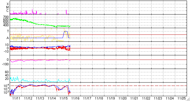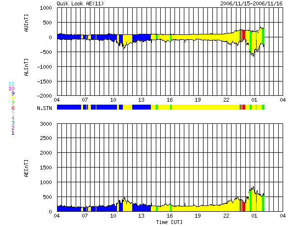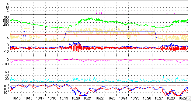 ACEが観測した太陽風の磁場(1番上の枠、白線は全体の強度、赤線は南北成分) および、太陽風の密度(3番目の橙線)、速度(4番目の黄線) (c) NOAA/SEC ![]() リアルタイムAE指数 下段のAEグラフの値が高くなると、オーロラ活動が活発化しています。 (c) 京都大学, NICT ![]() 27日の太陽周期に合わせたデータプロット 太陽が同じ面を地球に向けていた27日前の変化から、今後を予想することができます。 (c) NICT