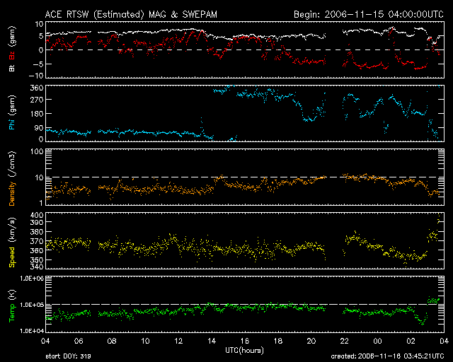 2006/11/16 12:45 更新 長時間太陽風の磁場が南を向いています。磁気圏で中規模の活動が起こっています。 担当 篠原 昨日より、太陽風は360km/秒前後のやや低速なままで安定しています。 磁場強度も、6nTに上がったまま概ね安定しています。 昨日の磁場強度と速度の変動は、小規模の変化に過ぎなかった様です。 太陽風磁場の南北成分が、16日4時(世界時15日19時)頃から連続的に南を向くようになりました。 現在まで、約8時間にわたって-5nTのやや強い南向きが続いています。 速度が遅めとはいえ、磁気圏への影響も発生しています。 オーロラ指数のAE指数は、500nTから800nTの中規模の変動が記録されています。 これは、オーロラ活動の強まりと、 磁気圏の大規模な対流運動の強まりの両方の効果が含まれていると思います。 現在の磁場の南向きがどこまで続くのか、はっきりしたことは分かりません。 いつまでも続く様な変化ではありませんので、やがて普通の状態に戻ると思います。 ただし、南を向いたままで速度が上昇することになると、オーロラ活動の規模は一気に拡大します。 27日周期で考えると、回帰性の高速太陽風がそろそろ地球にやってくる頃です。 今回は、923黒点群の影響で、コロナホールがSOHO EIT284の写真では見えなくなっていました。 コロナホールまでなくなってしまったのか、活動領域の明るさで見えなくなっているのか、 今後の太陽風の変化が注目されます。 高速風の始まりは、磁場強度の強まりで知ることができます。 現在、6nT前後にある磁場強度の線が、10nTを超えて強まって行くと、高速風の到来です。 磁気圏活動の強まりの影響で、放射線帯の高エネルギー電子の数が一気に減少しています。 警戒ラインを大きく割って、一段落ついています。 太陽では、新しくでてきた924黒点群でC1.8の小さめの小規模フレアが発生しています。 16日4時(世界時15日19時)頃です。 新しいこともあって、いくらか活動的なのかもしれません。 しかし、黒点群としての規模は小さいので、大きなフレアにはつながらないと思います。 引き続き、小規模フレアへの注意を行えばよいでしょう。 SOHO衛星のEIT284カメラの映像 (c) SOHO (ESA & NASA)