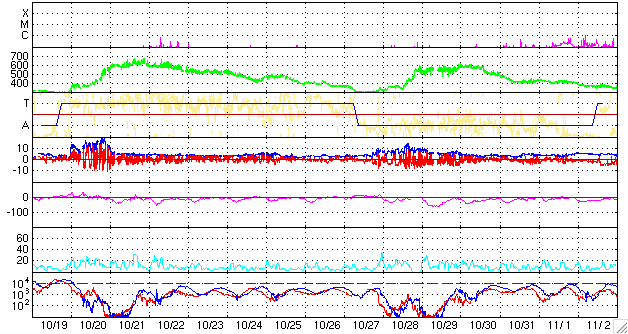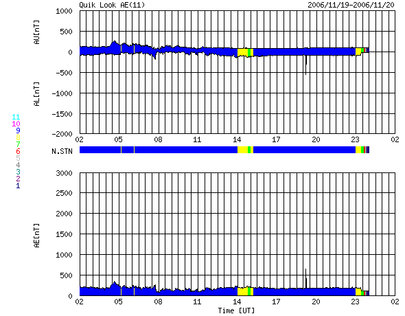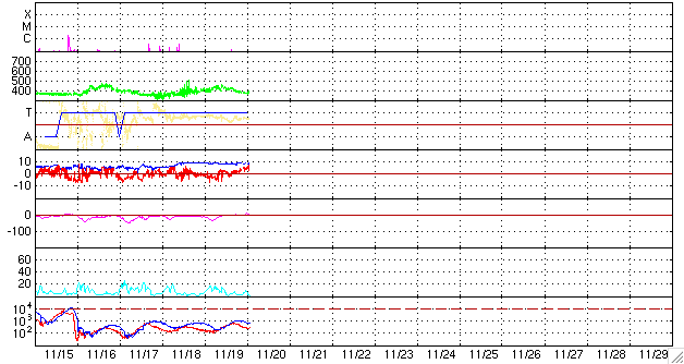 ACEが観測した太陽風の磁場(1番上の枠、白線は全体の強度、赤線は南北成分) および、太陽風の密度(3番目の橙線)、速度(4番目の黄線) (c) NOAA/SEC ![]() リアルタイムAE指数 下段のAEグラフの値が高くなると、オーロラ活動が活発化しています。 (c) 京都大学, NICT ![]() 27日の太陽周期に合わせたデータプロット 太陽が同じ面を地球に向けていた27日前の変化から、今後を予想することができます。 (c) NICT