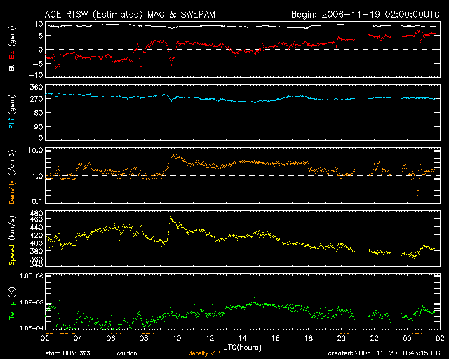 2006/11/20 10:42 更新 太陽風は通常の速度です(400km/秒)。オーロラ活動は穏やかです。 担当 篠原 概ね穏やかな宇宙天気が続いています。 太陽風は、速度(ACEの図の黄色線)が400km/秒を前後していて、通常の速度で安定しています。 磁場強度(白線)が8nTくらいにやや強まっていますが、 南北成分(赤線)は北寄り(プラス方向)になっていて、地球磁気圏への影響はあまり見られません。 オーロラの活動度を示しているAE指数のグラフはほとんど変化がなく、 磁気圏が穏やかな状態である事を示しています。 太陽風はこの後も、穏やかに推移すると予想されます。 磁場強度が強まっている間は、南北成分が南寄り(マイナス方向)に変わって、 オーロラなどの磁気圏活動を強める可能性があります。 ただ、速度が高くありませんので、乱れが起こっても規模は限定的です。 また、今後、磁場強度が下がって行けば、この様な乱れの可能性も無くなって行きます。 太陽風は23日ころまで穏やかな状態が続くと予想されます。 24日あたりから、次の乱れが始まりそうです。 SOHO EIT284の太陽写真では、コロナホールが太陽の中心線に達しています。 コロナホールがここに到達すると、3〜4日くらいで高速風が地球にやってきます。 太陽のフレア活動は穏やかです。 923黒点群が西の端に沈みつつあります。 924, 925黒点群は見え方が一段と淡くなっていて、規模が小さくなっているようです。 SOHO衛星のEIT284カメラの映像 (c) SOHO (ESA & NASA)