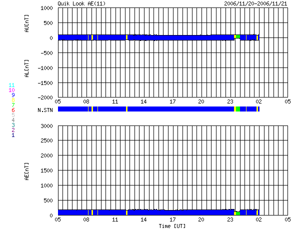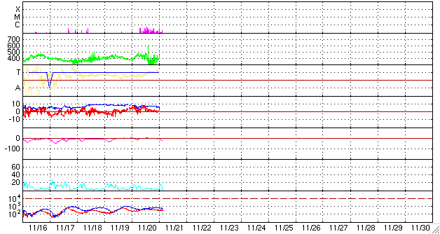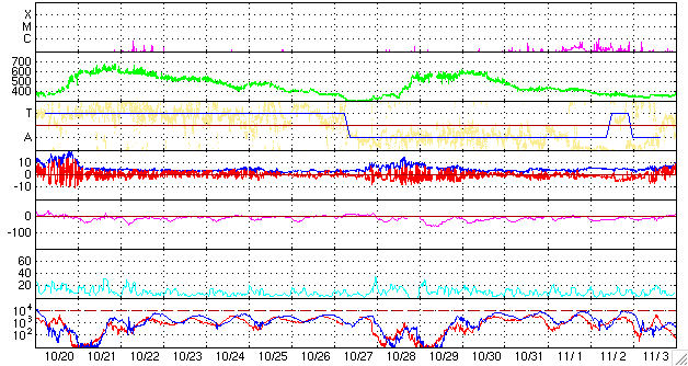 ACEが観測した太陽風の磁場(1番上の枠、白線は全体の強度、赤線は南北成分) および、太陽風の密度(3番目の橙線)、速度(4番目の黄線) (c) NOAA/SEC ![]() リアルタイムAE指数 下段のAEグラフの値が高くなると、オーロラ活動が活発化しています。 (c) 京都大学, NICT ![]() 27日の太陽周期に合わせたデータプロット 太陽が同じ面を地球に向けていた27日前の変化から、今後を予想することができます。 (c) NICT