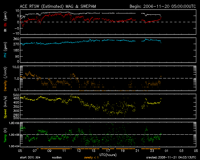 2006/11/21 13:04 更新 太陽風の粒子密度がかなり下がっています。磁気圏は穏やかな状態です。 担当 篠原 太陽風が面白い変化をしています。 速度は450km/秒から350km/秒の間をゆるやかに変化していますが、 プラズマの密度がかなり減っていた様です。 ACEの図の橙色の線は、太陽風のプラズマ粒子の陽子の密度を表しています。 1立方cmあたり、何個あるかという値です。 今日のグラフでは、まんなかあたりで0.1に近づき、一部は下に降りて見えなくなっています。 最低では0.1以下にまで下がっていたのではないでしょうか。 ここまで下がると、ACEの測定器の限界が近づいてきて、値が不安定になります。 密度が一番下がったあたりで速度のグラフが散らばって乱れているのは、そのためです。 1立方cmあたり0.1個とは、500mlのペットボトルに陽子が たった50個だけ入っているということになります。 そして、0.1を切っていた時間帯では、それ以下になっていたのです。 粒子が見えるなら、数えられそうな少なさです。 太陽風の速度は通常レベルで安定してます。 磁場強度も6nTと通常程度で、南北成分は北寄りに推移しています。 このため、磁気圏のオーロラ活動などはほとんど起こっておらず、 地球では、穏やかな状態が続いています。 このまま太陽風は穏やかな状態が続き、 24日頃から次の乱れがやってくるでしょう。 太陽では、923黒点群が間もなく西側(右側)に没します。 X線のグラフが小刻みに変動していますが、どの群が起こしているのかよく分かりません。 この様子だと、Cクラスの小規模フレアに達する可能性もありそうです。 (923群が起こしているなら、没した後は地球からは見えなくなります) また、東端(左端)の向こう側でCME(太陽ガスの放出現象)が発生しています。 LASCO C3の写真を見てください。 地球に対して横方向に飛び出していますので、影響はありません。 この後、こちらから活動的な領域が新しく現れるのかもしれません。 SOHO衛星のEIT284カメラの映像 (c) SOHO (ESA & NASA)