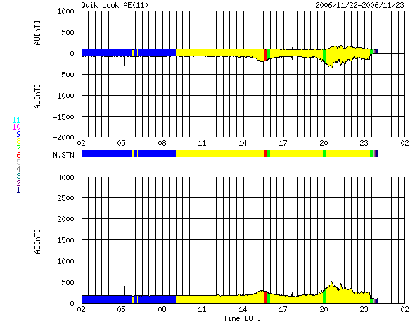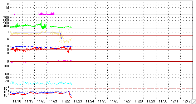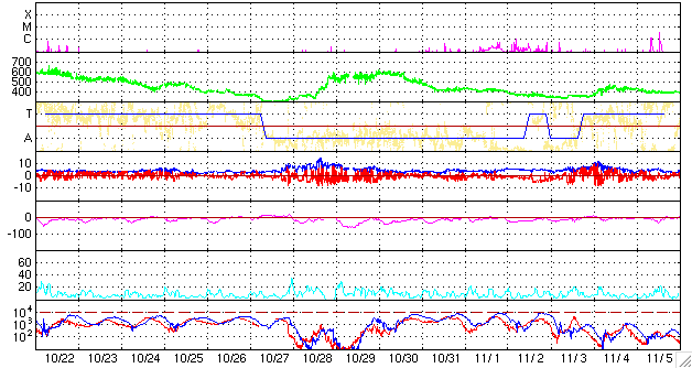 ACEが観測した太陽風の磁場(1番上の枠、白線は全体の強度、赤線は南北成分) および、太陽風の密度(3番目の橙線)、速度(4番目の黄線) (c) NOAA/SEC ![]() リアルタイムAE指数 下段のAEグラフの値が高くなると、オーロラ活動が活発化しています。 (c) 京都大学, NICT ![]() シベリアで観測された3日間の磁場データ 右側の3分の1が、昨日のデータになります。グラフが上がったり下がったりすると、オーロラ活動が活発化しています。 (c) NICT ![]() 27日の太陽周期に合わせたデータプロット 太陽が同じ面を地球に向けていた27日前の変化から、今後を予想することができます。 (c) NICT