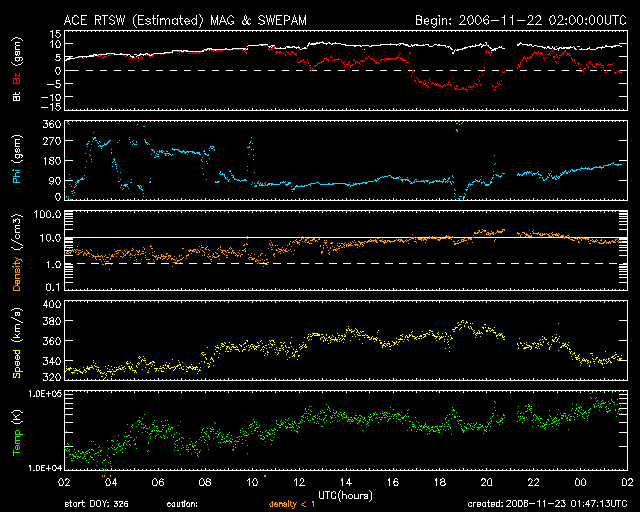 2006/11/23 10:48 更新 太陽風の磁場強度とプラズマ密度が増加しています。高速太陽風がまもなくやって来そうです。 担当 篠原 太陽風に変化が見えています。 高速風の到来が近づいているのかもしれません。 ACE衛星のデータを見ると、太陽風の磁場が、5nTの通常レベルからゆっくりと上昇して、 現在9nTくらいまで強まっています。 プラズマの密度(橙色線)も同じように上昇をして、 2個/立方cmから、10個/立方cmへ増加しています。 高速太陽風の前面では、これからやってくる高速風が、前にある低速風を押しこむために、 磁場強度やプラズマ密度が増加する傾向があります。 現在見えている変化は、この変化である可能性があります。 現在の太陽風の速度は、350km/秒を前後していて、やや低速のままです。 27日周期の図を見ると、磁場強度の変化は1日ほど早まって発生しています。 図の上段の前周期には、10月27日の後半に磁場の変化(青線)が見られました(図は世界時です)。 これを単純に下段に持って来ると11月23日の後半になりますが、 この図で見ると、既に昨日、11月22日の後半に変化が始まっています。 高速風の到来が1日ほど早まっているとすると、 今日の夜くらいから速度が上昇を始めると予想されます。 現在の磁気圏ですが、まだ、速度が遅いために概ね静穏です。 ただし、磁場強度が強まっているので、南向きが強まりやすい状態にあります。 実際、ACEの図で-5nTの強い南向きが4時間ほど発生している時間帯があります。 ここでは、小規模のオーロラ活動が発生していました。 AE指数のグラフが500nTくらいまで盛り上がっています。 シベリア磁場データで見ると、へこんだ部分がその活動にあたります。 電離圏を流れるオーロラ電流が強まったのです。 この変動の時は、南向きの磁場は強まったものの、速度が低速だったために、 オーロラ活動としては小さなものに留まったのです。 今後、速度が上昇を始めると、南を向いた場合の影響はどんどん大きくなります。 磁場強度が強い状態で、速度が上がり始めた時間帯は、 オーロラ活動が激しくなりやすいので注意してください。 太陽は黒点が見えなくなっています。 X線のグラフは強度自体がどんどん下がっていて、 太陽面に活動的な領域が無くなっている事を示しています。 フレア活動は静穏な状態が続くでしょう。 SOHO衛星のEIT284カメラの映像 (c) SOHO (ESA & NASA)