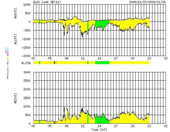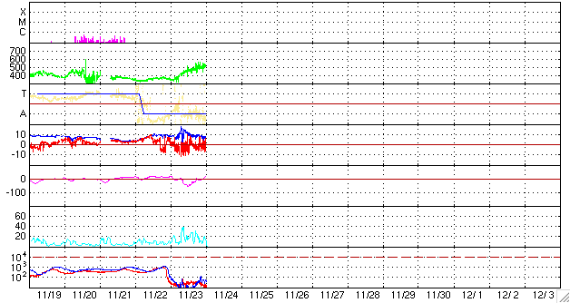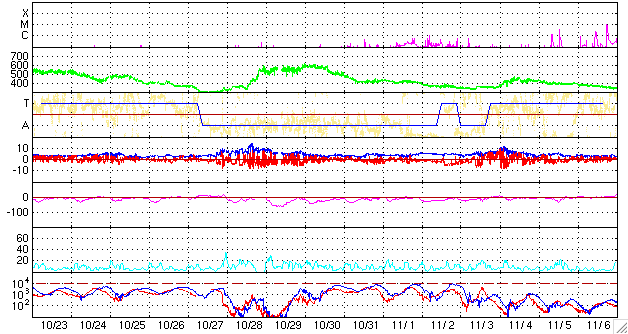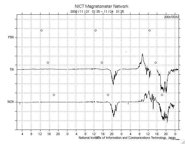 ACEが観測した太陽風の磁場(1番上の枠、白線は全体の強度、赤線は南北成分) および、太陽風の密度(3番目の橙線)、速度(4番目の黄線) (c) NOAA/SEC ![]() リアルタイムAE指数 下段のAEグラフの値が高くなると、オーロラ活動が活発化しています。 (c) 京都大学, NICT ![]() シベリアで観測された3日間の磁場データ 右側の3分の1が、昨日のデータになります。グラフが上がったり下がったりすると、オーロラ活動が活発化しています。 (c) NICT ![]() 27日の太陽周期に合わせたデータプロット 太陽が同じ面を地球に向けていた27日前の変化から、今後を予想することができます。 (c) NICT