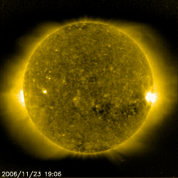 2006/11/24 10:34 更新 高速風がやって来ました。太陽風の速度は500km/秒に上がり、活発なオーロラ活動が発生しています。 担当 篠原 昨日のニュース以降、太陽風の速度が上昇を始めました。 23日11時(世界時23日2時)に350km/秒と低速だった太陽風は、 ゆっくりと上昇して、24日2時(世界時23日17時)に500km/秒に達しました。 現在まで、この高速状態で安定しています。 一方、昨日のニュースの時点で強まり(9nT)を見せていた太陽風磁場の強度は、 速度が上がり始める頃に15〜20nTまで強まりました。 速度が本格的に上がると、一段落着いて、弱まり始め、 現在まで9nTくらいで安定しています。 依然、強めの状態です。 27日周期の図を見ると、高速風の到来は1日ほど早まっています。 最高速は前回が、550〜600km/秒だったのと比較すると、やや落ちています。 しかし、磁場強度は現在も強まったままですので、 これから、もう一段の速度上昇が見られるかもしれません。 磁場強度が5nTくらいに下がるまでは、注意が必要です。 高速風は、明後日くらいにかけて続くと予想されます。 太陽風磁場が強まっているため、南向きの成分が強まりやすい状況になっています。 ACEの図を見ると、前半のところで-5〜-10nTの強めの南向きがほぼ連続的に発生しています。 また、後半でも-5nTの南向きが頻繁に見られています。 このため、オーロラの活動も活発になっています。 オーロラの活動度を示すAE指数では、500nTから1000nTの活発な活動が1日を通して観測されています。 シベリアの磁場データでも、昨日になって、急に変動が大きくなっているのが分かります。 極域の空はかなりにぎやかだったのではないでしょうか。 現在、速度が高く、磁場強度も強い状態が続いています。 南北成分も南向きが現れ続けているので、 活発なオーロラ活動が続いているのではないでしょうか。 放射線帯の高エネルギー電子は、活発な磁気圏活動の影響で、 一気に数を減らしています。 こちらは、高速風の後半から増加を始めるはずです。 今後の変化に注目する必要があります。 太陽は黒点が見られない状態です。 X線のグラフも低く、穏やかな太陽が続いています。 SOHO EIT284の太陽写真では、太陽の東端(左端)に明るい領域が見えていて、 こちらからやがて黒点が上がって来るかもしれません。 SOHO衛星のEIT284カメラの映像 (c) SOHO (ESA & NASA)