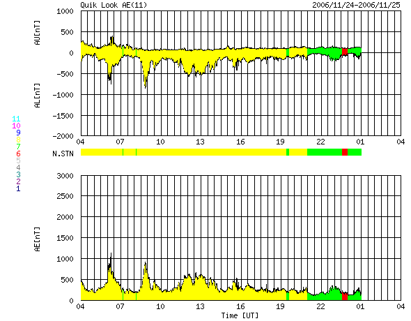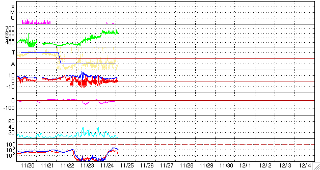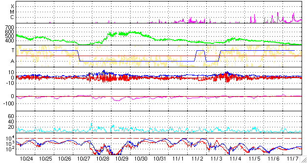 ACEが観測した太陽風の磁場(1番上の枠、白線は全体の強度、赤線は南北成分) および、太陽風の密度(3番目の橙線)、速度(4番目の黄線) (c) NOAA/SEC ![]() リアルタイムAE指数 下段のAEグラフの値が高くなると、オーロラ活動が活発化しています。 (c) 京都大学, NICT ![]() 27日の太陽周期に合わせたデータプロット 太陽が同じ面を地球に向けていた27日前の変化から、今後を予想することができます。 (c) NICT