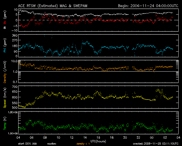 2006/11/25 12:12 更新 コロナホールによる高速の太陽風が続いています(600km/秒)。オーロラ活動も活発に発生しています。 担当 篠原 高速の太陽風が続いています。 太陽風の速度は、24日16時(世界時24日7時)にもう一段上昇し、 それまでの500km/秒から、600〜650km/秒となりました。 コロナホールの高速風としては、高速になったほうだと言えます。 その後、現在まで同程度の高速状態が続いています。 太陽風の磁場は、速度の上昇とともに10nTから5nTへと弱まっています。 このことから、高速風は最高速に達したと考えられます。 地球への影響を決める、太陽風磁場の南北成分は、 ACEの図の前半では、-5nTから-3nTくらいの南向きが連続的に現れています。 それほど大きな南向きではありませんが、速度が高まっているため、 活発なオーロラ活動が発生しています。 AE指数では1000nT近いオーロラ活動(変化の様子から、オーロラ爆発が連発したようです) が記録されています。 極域では、にぎやかなオーロラを何度も楽しむことができたでしょう。 ACEの図の後半では、南北成分が弱まって、0nT付近に近づいています。 振幅が小さいながらも南向きも含まれていて、小規模のオーロラ活動には繋がっている様です。 AE指数で200〜300nTの小規模の変動が続いています。 現在、磁場強度が弱まってしまったため、大きな南向きが現れる可能性は小さくなっています。 ですが、速度がかなり高いので、小さな南向きでも活発なオーロラ活動には繋がります。 27日周期を見ると、高速風は今日から明日にかけて続くと思われます。 速度が高い間は、オーロラ活動が強まる可能性が続きます。 放射線帯の高エネルギー電子は、昨日より、一気に数を増やしています。 現在、太陽風の速度がだいぶ高くなっているので、 これから一段と上昇するのではないかと思われます。 今後の高エネルギー電子の変化に注意して下さい。 10の4乗のラインを超えるほどになると、 人工衛星で障害が発生しやすくなると考えられています。 一方、太陽は、無黒点でとても穏やかです。 X線のグラフでは、強度が増加の傾向にあります。 これは、太陽の東側のまだ向こう側にある活動領域が、 こちら側に向かってきているためだと思われます。 SOHO EIT284の太陽写真で、左に明るく見えている領域です。 どのような黒点群が見えて来るでしょうか。 SOHO衛星のEIT284カメラの映像 (c) SOHO (ESA & NASA)