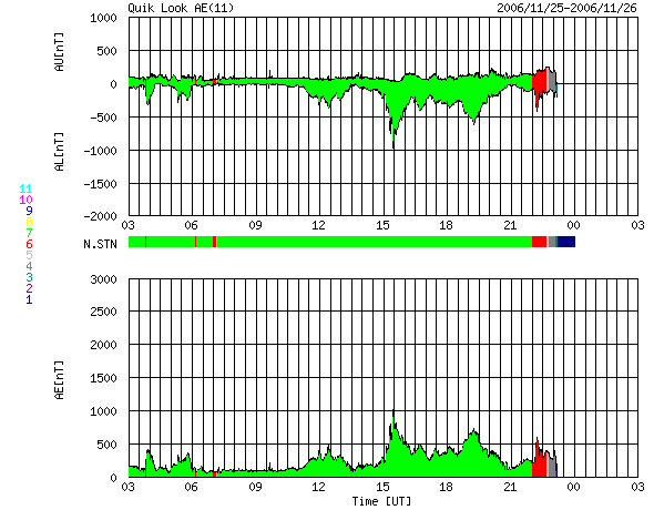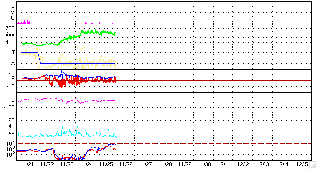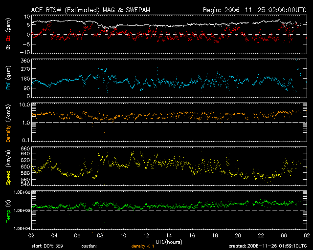 2006/11/26 11:00 更新 高速の太陽風が続いています(600km/秒)。放射線帯高エネルギー電子が増加を始めています。 担当 篠原 高速の太陽風が続いています。 昨日より、580km/秒〜620km/秒の安定した高速状態が続いています(ACEの黄色線)。 27日周期の図で、前回のこの高速風と比較すると、 最高速は高く、継続期間も長くなっていて、高速風領域の規模が大きくなった様です。 太陽風の磁場強度(白線)は、6nTと通常の強さで安定しています。 南北成分(赤線)は、-3nTと小さめですが南向き(マイナス)が頻繁に現れています。 連続しているというのではなく、細かく振動しながら南寄りが続いているという変化です。 この南向き磁場は、振幅としてはそれほどではありませんが、 速度が高いため、比較的活発なオーロラ活動を起こしています。 AE指数では、500nTを超える活動が2度見られ、 その他の時間帯でも500nTクラスの変動が続いています。 この3日間ほどオーロラ観望にはすばらしい日が続いている様です。 初めに書きましたが、高速風帯は規模が拡大している様で、 まだしばらく高速風は続きそうな気配です。 とういのは、太陽風の磁場強度が5nTレベルを保っているためで、 これがもう少し下がらないと、速度の低下が始まらないように感じます。 前周期の変化で考えると、今日いっぱいは現状レベルの高速風が続き、 明日に入った頃から速度が低下すると予想されます。 今周期、高速風の始まりは1日ほど早まっていました。 終わり方はどうなるでしょうか。 放射線帯の高エネルギー電子が数を増しています。 今日のグラフでは、警戒ライン(10の4乗の線)には達しませんでしたが、時間の問題でしょう。 高速風が続いている事から、明日には青線のGOES11が超えると思います。 あるいは、赤線のGOES12でも超えているかもしれません。 高速太陽風の後半からは放射線帯の変化に注意が必要です。 一旦増加すると、減少はとてもゆっくりです。 今後、数日にわたって警戒状態が続くと思われます。 太陽では、東の端(左端)から新しい黒点が姿を現しました。 926黒点群です。 11月22日のニュースで掲載したCME(太陽ガスの放出現象)は、 この黒点群が起こしたのかもしれません。 X線のグラフを見ると、目立った変化はなく、 現在はそれほど活動的な状態ではないのかもしれません。 まだ、詳しい様子が分かりませんので、今後の変動に注目したいところです。 ACEが観測した太陽風の磁場(1番上の枠、白線は全体の強度、赤線は南北成分) および、太陽風の密度(3番目の橙線)、速度(4番目の黄線) (c) NOAA/SEC ![]() リアルタイムAE指数 下段のAEグラフの値が高くなると、オーロラ活動が活発化しています。 (c) 京都大学, NICT ![]() シベリアで観測された3日間の磁場データ 右側の3分の1が、昨日のデータになります。グラフが上がったり下がったりすると、オーロラ活動が活発化しています。 (c) NICT ![]() 27日の太陽周期に合わせたデータプロット 太陽が同じ面を地球に向けていた27日前の変化から、今後を予想することができます。 (c) NICT
