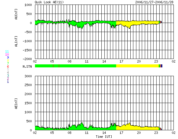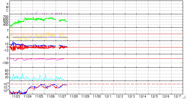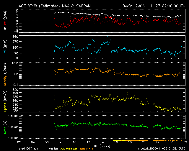 2006/11/28 10:29 更新 太陽風の速度は下がり始めています(520km/秒)。オーロラ活動も次第に小規模になっています。 担当 篠原 太陽風はゆっくりと速度が下がりつつあります。 昨日より、太陽風の速度は560km/秒を前後するように変化し、 今朝に入って、520km/秒へと一段下がっています。 この後も、引き続きゆっくりと低下が続くものと思われます。 27日周期の図で見ると、23日に始まった今回の高速風は、 今日、28日まで、6日間に渡って続いたことになります。 図の上段の前周期の変化と比較すると、速度の盛り上がりがずいぶん立派になったのが分かります。 磁場強度は、5nTから次第に下がり、2nTまで弱まっています。 この弱まりも、高速風帯が終盤を迎えていることを示しているのでしょう。 速度自体はまだ高速状態ですが、磁場強度がすっかり弱まってしまったため、 南に向いても小さな値しか現れていません。 このため、磁気圏へ流れ込むエネルギーも小さくなってきています。 それに対応するように、オーロラ活動も次第に小規模になっています。 今日のAE指数のグラフは、300nTくらいの比較的小さな変動が発生しているだけです。 しかし、回数としては、一日を通して度々起こっていますので、 華やかではないものの、極域ではオーロラを楽しむことができたでしょう。 アラスカのライブカメラでその様子を見ることができます。 http://salmon.nict.go.jp/awc/live/index.php また、シベリアの磁場データの図で3日間の移り変わりを見ると、 変動が次第に小規模になっている様子がよく分かります。 シベリアの図の観測点はオーロラのすぐ下にあり、 オーロラが活動する時に100kmほど上空(電離圏)で流れている電流の変化を磁場変化として検知します。 グラフが上や、下に大きく変化すると、 そのとき、上空に活発なオーロラが光っていると考えることができるのです。 磁場データが上に変化するか、下に変化するかは、上空に流れる電流の向きに関係します。 さて、高速風帯が終わろうとしていますが、 太陽には次のコロナホールが姿を現しています。 それほど大きなものではありませんが、太陽の中心から南(下)に向かって伸びています。 今日と、27日前の写真をGOES13のX線写真で比較します(SOHOはお休み中です)。 このコロナホールは、前周期は太陽の北寄りで目立っていました。 今回は北側は小さくなり、中心付近が濃くなっています。 27日周期の図で前周期を見ると、11月4-5日にとても小さな速度の山がありますが、 この部分が今回、もう少し大きくなっているかもしれません。 コロナホールが太陽の中心に達していますので、 影響が見られるのは3日後の、12月1日頃でしょう。 どの様な変化が現れるか、注目したいところです。 放射線帯の高エネルギー電子が若干増加しています。 青線のGOES11が警戒ラインに達しています。 明日にかけてもう少し増加するかもしれませんが、 今回の高速風では、それほど大きな増加にはならなかった様です。 ただし、多めではありますので、ある程度の注意は必要でしょう。 太陽では、926黒点群に続いて、927黒点群が出現しています。 X線のグラフを見ると、小さな変動が見られていて、 あるいはCクラスの小規模フレアに達するものが発生するかもしれません。 GOES13衛星のX線カメラで撮影した太陽の様子。28日9時半(世界時28日0時半)。元の写真はやや左に傾いています。 (c) NOAA/SEC ![]() 27日前にGOES13衛星のX線カメラで撮影した太陽。11月1日9時半(世界時1日0時半)。コロナホールの変化が分かります。 (c) NOAA/SEC ![]() ACEが観測した太陽風の磁場(1番上の枠、白線は全体の強度、赤線は南北成分) および、太陽風の密度(3番目の橙線)、速度(4番目の黄線) (c) NOAA/SEC ![]() リアルタイムAE指数 下段のAEグラフの値が高くなると、オーロラ活動が活発化しています。 (c) 京都大学, NICT ![]() シベリアで観測された3日間の磁場データ 右側の3分の1が、昨日のデータになります。グラフが上がったり下がったりすると、オーロラ活動が活発化しています。 (c) NICT ![]() 27日の太陽周期に合わせたデータプロット 太陽が同じ面を地球に向けていた27日前の変化から、今後を予想することができます。 (c) NICT