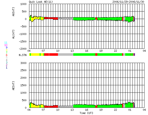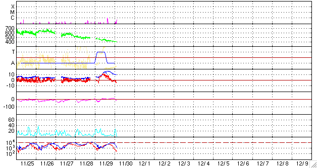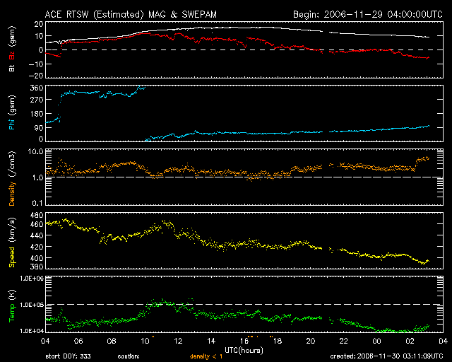 2006/11/30 12:12 更新 太陽風の磁場強度が大きく強まりました(17nT)。現在、南寄りの傾向が現れていますので、磁気圏活動が強まりそうです。 担当 篠原 昨日のお昼、29日12時(世界時29日4時)頃から太陽風磁場の強度が強まり始め、 それまでの5nTレベルから、29日21時(世界時29日12時)には15nTを超えるほどに強まりました。 その後、8時間ほど15nTレベルの強度を保ち、ゆっくりと低下が始まっています。 現在は、ちょうど10nTに戻ったところです。 太陽風の速度にはほとんど乱れは無く、 太陽から大きな磁場のかたまりが飛ばされて来たのだと思われます。 この様な変化の時は、磁場が強まっているために、 強い南向きが発生して、磁気圏が一気に活動的になることがあります。 ACEの図を見ると、磁場の南北成分は、始め北寄り(プラス方向)に強まりました。 10nTくらいまで強まったところで頭打ちになり、 その後は、磁場強度は上昇を続けましたが、北向き磁場は次第に弱まっています。 そして、今朝、30日6時(世界時29日21時)頃に0nTに下がり、 30日10時(世界時30日1時)からは南向き(マイナス方向)に切り替わっています。 前半部は北向きだったため、磁気圏への影響はほとんどありませんでした。 オーロラの活動度を示すAE指数には、目立った変化は記録されていません。 この場合、太陽風磁場が北に偏るか、南に偏るかは、その時の発生源の太陽次第ですので、 反対に南に偏った磁場が流れて来る可能性もあります。 その場合は、この時間帯でオーロラ活動が強まったり、磁気嵐が発生したと予想されます。 現在、磁場の強まりは減衰しつつありますが、 南北成分が南向き傾向に切り替わりました。 したがって、これから磁気圏活動がある程度活発になると予想されます。 現在の南向き成分は、-5nTです。 ただ、太陽風の速度は400km/秒の通常レベルに下がっていますので、 激しい活動になることはないでしょう。 中小規模のオーロラ活動が見られたり、小規模の磁気嵐状態になるかもしれません。 今後、南向き磁場の強度がどのくらいになるか、いつ頃まで続くかに注目してください。 今回の太陽風の乱れは、今日一日でほぼ終わるでしょう。 この後、小規模のコロナホールによる太陽風の乱れが見られるかもしれません。 GOES13のX線画像でコロナホールの様子を見てください。 太陽の南西(右下)に見えている小さな影です。 大きさが小さいことと、南に寄っていることから、地球への影響はそれほど大きくはないでしょう。 ただ、前周期にも小さな乱れが見られていましたので(11月3-5日)、 それが今回どのように変わっているかが興味あるところです。 また、X線画像では太陽の東側(左側)に大きめのコロナホールが見えています。 これは、27日周期の図の11月9日から始まる高速太陽風の発生源にあたるものです。 今回も地球に乱れをもたらしそうです。 もう2日ほどすると、規模の変化などがより見やすくなると思います。 放射線帯の高エネルギー電子は、警戒ラインを切って、減少しています。 今後は、次第に数を減らしていくでしょう。 また、現在の太陽風磁場の南向きの影響で、磁気圏活動が強まると、 明日は一気に減少している可能性もあります。 太陽では、新しい927黒点群でC1の小さなの小規模フレアが発生しています。 30日0時(世界時29日15時)です。 X線のグラフでは、Bクラスレベルですが、全体的にざわついた状態になっていて、 引き続き小規模フレアが発生するかもしれません。 現在の927黒点群の規模はそれほどでありませんので、大きな活動にはならないでしょう。 927黒点群はこれから更に成長するのでしょうか。 GOES13衛星のX線カメラで撮影した太陽の様子。30日11時(世界時30日2時)。元の写真はやや左に傾いています。 (c) NOAA/SEC ![]() ACEが観測した太陽風の磁場(1番上の枠、白線は全体の強度、赤線は南北成分) および、太陽風の密度(3番目の橙線)、速度(4番目の黄線) (c) NOAA/SEC ![]() リアルタイムAE指数 下段のAEグラフの値が高くなると、オーロラ活動が活発化しています。 (c) 京都大学, NICT ![]() 27日の太陽周期に合わせたデータプロット 太陽が同じ面を地球に向けていた27日前の変化から、今後を予想することができます。 (c) NICT