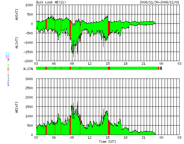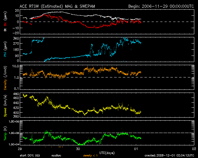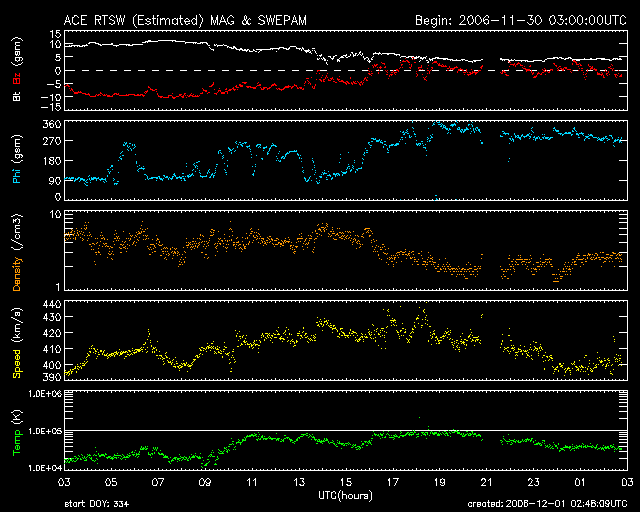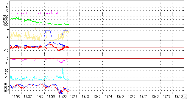 2006/12/ 1 11:50 更新 太陽風磁場が長時間大きく南を向き(-10nT)、激しい磁気圏擾乱が発生しました。 担当 篠原 昨日のニュースで、太陽風磁場が南を向き始めたことをお伝えしましたが、 その後、南向きは更に強まり、30日13時(世界時30日4時)頃には-10nTに達しました。 磁場強度そのものが10nT程度でしたので、ほとんど最大限に南を向いたと言えます。 -10nTの強い南向きは、30日19時(世界時30日10時)まで6時間に渡って続き、 その後も-5nT程度の南向きが、日付が変わった12月1日1時(世界時30日16時)まで続きました。 今日の1枚目の図は、ACE衛星による太陽風データの3日幅の図です(実質2日分のデータですが)。 この程度の時間幅で見ると、今回の太陽風の乱れがよく分かります。 磁場強度(白線)を見てください。 図のほぼ最初の部分から大きく増加をして、1日半くらいの幅の山ができています。 興味深いのは南北成分(赤線)です。 初めは、磁場強度(白線)に従うように、大きく北向き(プラス方向)に強まっていますが、 やがて白線を離れて0nTの線に向かい(南北成分が弱まった)、 やがて大きく南を向き始めます(マイナス方向)。 磁場の山の中で、大きくプラス、マイナスへ回転するような変化になっています。 太陽から太陽風に乗って磁場のかたまりが流れて来るとき、 その中で磁場構造が大きな螺旋を描いていていると考えられています。 そこを地球が横切ると、螺旋形の影響で、磁場の方向がぐるっと回転します。 その様子を、今回は南北成分に見ることができたのでしょう。 磁場のかたまりが流れてきて、強い南向きが長時間発生すると、 地球の磁気圏が激しく活動します。 今回もAE指数では、1000nTから1500nTに達する激しい変動が観測されています。 極域ではかなり激しいオーロラ活動が見られたのではないでしょうか。 沖縄の磁場データも、静穏レベル(青の横線)から、最大で-100nT下がる変化を示しています。 この値が下がるほど、赤道上空に磁気圏擾乱の強い電流が流れていることを示しています。 世界規模で変動を調べているDst指数でも、最大は-100nT程度まで下がっています。 ただし、擾乱の開始前が-30nTでしたので、実質的には-70nT程度の減少だったと考えられます。 長時間の強い南向き磁場の影響で、中規模の磁気嵐が発生していたことになります。 現在の沖縄の磁場データでは、磁場の減少はかなり回復していますが、 これは地域的な効果も含んでいて、 世界的なDst指数ではまだ半分程度の回復です。 今回の太陽風磁場の乱れの間、太陽風の速度は400km/秒の通常の速度でほとんど安定していました。 このため、磁気圏の擾乱は大きくはなりましたが、極端に激しいものには発達しませんでした。 太陽風から磁気圏へ流れ込むエネルギーの大きさは、 太陽風の速度と、南向きの磁場強度とで決まります。 今回は、南向き磁場は強かったのですが、速度がそれほどでもなかったため、 中規模レベルの磁気圏擾乱に留まったとも言えます。 磁場のかたまりは過ぎ去りましたので、 この後は普段の太陽風の変化に戻ります。 ひとまず穏やかな状態になりそうですが、小規模のコロナホールの影響が見られるかもしれません。 前周期を見ると、今日に相当するところに(11月4日)、小さな速度の山が見えています。 放射線帯の高エネルギー電子は、大きく減少しています。 この後もこのまま低いレベルで推移すると思われます。 太陽面では、新しく928黒点群が、中心からやや西に(右に)寄ったところに発生したそうです。 掲載の写真では小さすぎて、ほとんど見つけることができません。 926, 927黒点群は規模にほとんど変化はありません。 X線グラフの小刻みな変動は減少していて、黒点群たちは落ち着いて来ている様です。 ACE衛星による、3日間の太陽風の変化。太陽風にのって大きな磁場のかたまりがやって来た(白線)。 (c) NOAA/SEC ![]() GOES13衛星のX線カメラで撮影した太陽の様子。12月1日2時(世界時11月30日17時)。元の写真はやや左に傾いています。 (c) NOAA/SEC ![]() ACEが観測した太陽風の磁場(1番上の枠、白線は全体の強度、赤線は南北成分) および、太陽風の密度(3番目の橙線)、速度(4番目の黄線) (c) NOAA/SEC ![]() リアルタイムAE指数 下段のAEグラフの値が高くなると、オーロラ活動が活発化しています。 (c) 京都大学, NICT ![]() 沖縄の磁場擾乱 下へ下がるほど、擾乱が発達している事を意味します。 (c) NICT ![]() 27日の太陽周期に合わせたデータプロット 太陽が同じ面を地球に向けていた27日前の変化から、今後を予想することができます。 (c) NICT