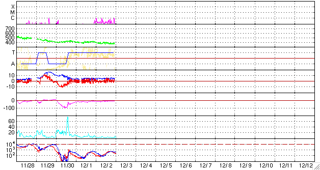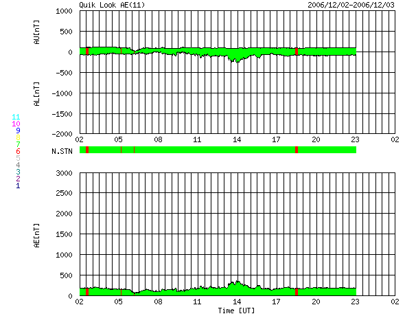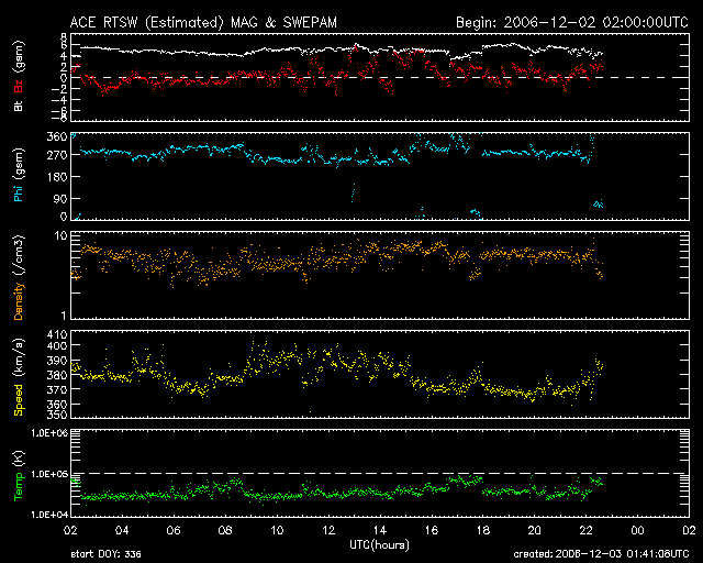 2006/12/ 3 10:43 更新 926黒点群が小規模フレアを3回起こしています。太陽風、磁気圏は静穏です。 担当 篠原 太陽風は穏やかな状態が続いています。 速度は380km/秒前後でほとんど変化がありません。 磁場強度も5nTで安定しています。 速度、磁場強度ともに通常のレベルです。 太陽風磁場の南北成分は、0nT付近に小幅の変化で留まっています。 そのため、磁気圏は穏やかな状態です。 オーロラの活動度を示すAE指数には、目立った変動はありません。 速度や磁場強度は普段のレベルですので、 -3nTくらいでも南向きが続く様になれば、小規模のオーロラ活動が起こるのですが、 今日のACEの図の様に、南向きがほとんど見られない状況では、 ほんとうに穏やかになってしまいます。 太陽風はこれから明後日にかけて、穏やかな状態が続くでしょう。 速度は更に下がって行くと思われます。 そして、12月6日頃から次の乱れが始まりそうです。 太陽面では、926黒点群が発達をしています。 昨日の写真と比較してみると、黒点群内に小さな黒点が増えているのが分かります。 そして、2日9時(世界時2日0時)、2日16時(世界時2日7時)、3日7時(世界時2日22時)、 と3回にわたってC1と小さいですが小規模フレアを起こしています。 引き続き、小規模フレアを発生させる可能性があります。 更に成長するのか、ここまでなのか、注目されます。 ACEが観測した太陽風の磁場(1番上の枠、白線は全体の強度、赤線は南北成分) および、太陽風の密度(3番目の橙線)、速度(4番目の黄線) (c) NOAA/SEC ![]() リアルタイムAE指数 下段のAEグラフの値が高くなると、オーロラ活動が活発化しています。 (c) 京都大学, NICT ![]() 27日の太陽周期に合わせたデータプロット 太陽が同じ面を地球に向けていた27日前の変化から、今後を予想することができます。 (c) NICT