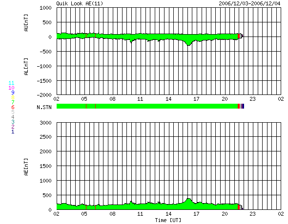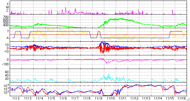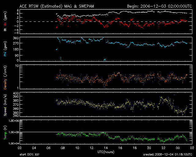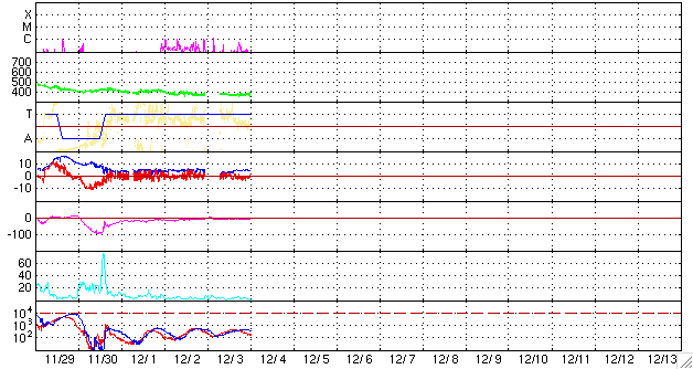 2006/12/ 4 10:20 更新 太陽風は速度が遅く、磁気圏も穏やかです。小規模フレアが発生しています。 担当 篠原 太陽風は、速度が370km/秒前後とやや低速で安定しています。 ACEの図の最後のところでは、350km/秒へもう一段下がっています。 一時的な低下の可能性もありますが、前周期の傾向を参考にすると、 このまま更に下がっていく可能性が高そうです。 太陽風の磁場強度は4nTで、こちらは普通の大きさです。 南北成分は弱いですが、やや南寄りの傾向に見えます。 ただし、大きくても-3nTくらいと小幅ですので、 速度が遅いことと重なって、磁気圏への影響はかなり小さいと思われます。 実際、AE指数を見ると、ほとんど変化がない状態です。 12月に入って、GOES13のX線太陽写真が更新されておらず、 コロナホールの最新状況が分かりません。 27日周期の図だけで今後を予想することになりますが、 前周期11月9日にやってきた高速太陽風が、そろそろ帰って来ます。 単純にカレンダーを当てはめると、到来は12月6日になります。 細かく見ると、速度と磁場の高まりは、6日の真ん中あたりから始まりそうです。 図は世界時(日本時間から-9時間した時刻)ですので、 日本時間で考えると、6日の夜になります。 実際には、太陽風はそこまで正確に27日の周期性を持っている訳ではなく、 1日程度前後することは普通に起こります。 しかし、27日の図を見ながら、狙いを定めてみることも面白いと思います。 高速風の始まりでは、磁場強度が先に強まります。 その時に、大きな南向きになって、 激しいオーロラ活動がもたらされる可能性が高まります。 11月9-10日がその状態で、-10nTを超える強い南向き磁場が発生しています。 沖縄のデータを見ると、 「沖縄変動」が-80nTくらいまで下がっていて、磁気嵐が発生していたことを示しています。 また、「沖縄短気変動」が強まっていて、 この時、極域でオーロラ活動が強まっていたことを示しています。 今周期はどのような変化になるでしょうか。 太陽では、昨日お知らせした3つの小規模フレアに続いて、 3日12時半(世界時3日3時半)にもC1の小さな小規模フレアが発生しています。 発生源は926黒点群です。 その後も、Bクラスの小さな変化も記録されていて、やや活動的な状態が続いている様です。 926黒点群は、規模としては幾分縮小しているようで、 これ以上大きな活動を始めることはなさそうです。 フレア活動は現状レベルの変動に留まりそうです。 ACEが観測した太陽風の磁場(1番上の枠、白線は全体の強度、赤線は南北成分) および、太陽風の密度(3番目の橙線)、速度(4番目の黄線) (c) NOAA/SEC ![]() リアルタイムAE指数 下段のAEグラフの値が高くなると、オーロラ活動が活発化しています。 (c) 京都大学, NICT ![]() 27日の太陽周期に合わせたデータプロット 太陽が同じ面を地球に向けていた27日前の変化から、今後を予想することができます。 (c) NICT