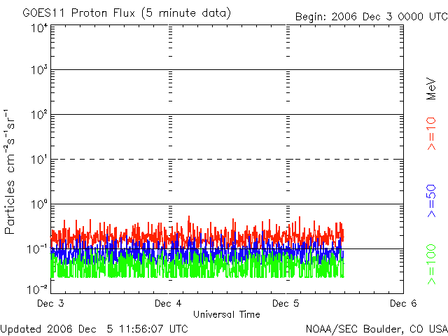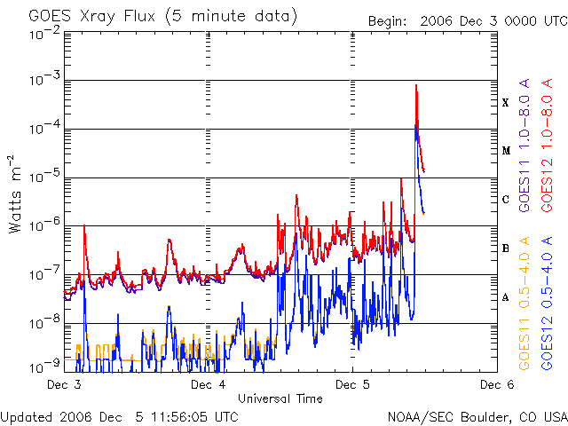 2006/12/ 5 21:00 更新 太陽でX9.1の非常に大規模なフレアが発生しました。今後の変化に警戒が必要です。 担当 篠原 先ほど速報でお知らせしたように、5日19時半(世界時5日10時半)に、 太陽でX9.1の非常に大規模なフレアが発生しました。 発生場所は、太陽の東端(左端)の地球側に向きつつある領域です。 GOES13によるX線画像の動画を掲載します。 フレアによる猛烈な輝きが記録されています。 この動画で、フレアの光が減少した後も、X線の画像に白い横線が残っています。 あるいは猛烈な明るさで、カメラの電子部品に障害が発生してしまったのかもしれません。 GOES13のX線カメラはこれから本格稼働という段階なので、気がかりです。 また、9月に打ち上がったばかりの日本の太陽観測衛星「ひので」は大丈夫でしょうか。 こちらも太陽を直視している衛星だけにたいへん気になります。 Xクラスのフレアは、2005年9月以来の発生です。 太陽活動の極小期を迎えて、フレア活動としては穏やかな日々が続いていましたが、 突然の激しい活動になりました。 これから、非常に高速の高エネルギープロトン(太陽放射線)が 地球へやってくる可能性があります。 フレアが太陽の東端で起こったので、到来にはいくらか時間がかかると思われますが、 猛烈なフレアでしたので、今後の変化には注意が必要です。 太陽放射線の増加が起こると、人工衛星では障害が発生しやすくなります。 また、このフレアに伴って、CME(太陽ガスの放出現象)も発生していると予想されます。 地球から見てほぼ真横に向かってガスが飛び出していますので、 真正面で直撃を受ける場合と比較すると格段に影響は小さいはずです。 それでも、フレアの規模が非常に大きいですから、どのような状況になるか、 今後の太陽風の変化に注目する必要があります。 SOHO衛星のLASCO C2, C3の写真はまだ得られていません。 こちらでCMEの吹き出し具合が分かれば、影響を予測することも可能かもしれません。 明日以降に得られる画像に注目したいところです。 この活動領域は、引き続き激しいフレア活動を続ける可能性があります。 いまだX1-2クラスならば簡単に起こしうるのではないでしょうか。 フレア活動をはじめ、今後の宇宙天気に対して警戒を続ける必要があります。 GOES13衛星のX線カメラで撮影したX9.1の非常に大規模なフレア。5日19時半(世界時5日10時半)に発生した。 (c) NOAA/SEC ![]() SOHO MDIカメラによる、12月5日の太陽黒点の様子。 (c) ESA & NASA ![]() GOES衛星の太陽X線データ (c) NOAA/SEC ![]() GOES衛星の太陽放射線データ (c) NOAA/SEC ![]() | |||||||||||||||||||||||||||||||||||||||