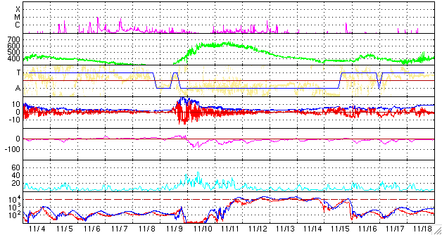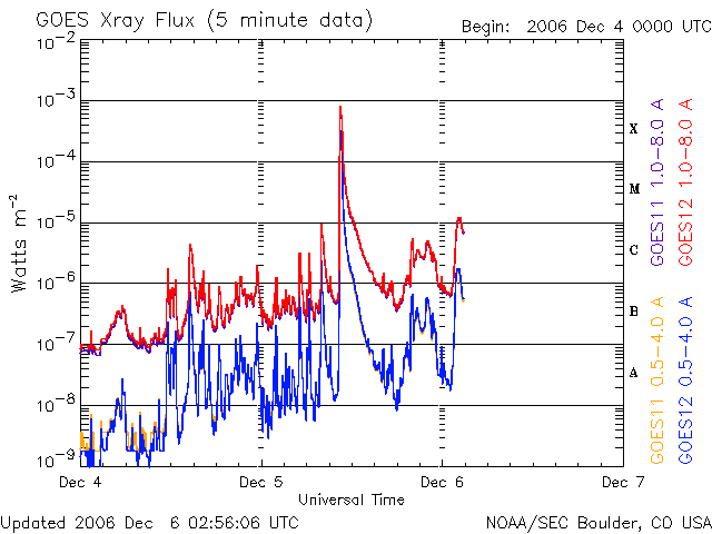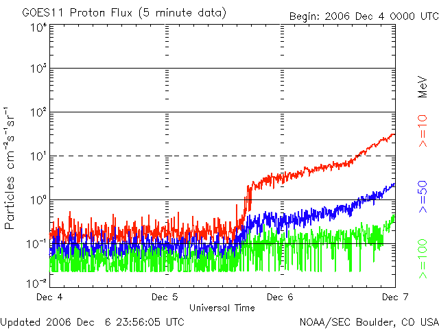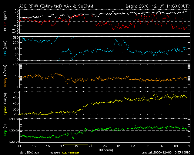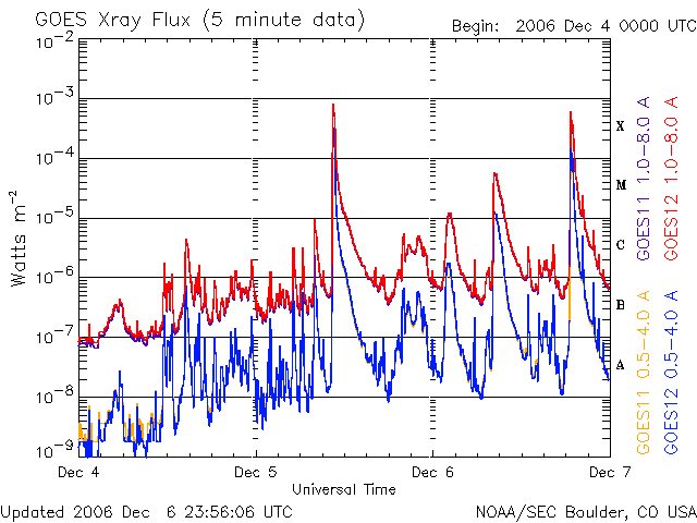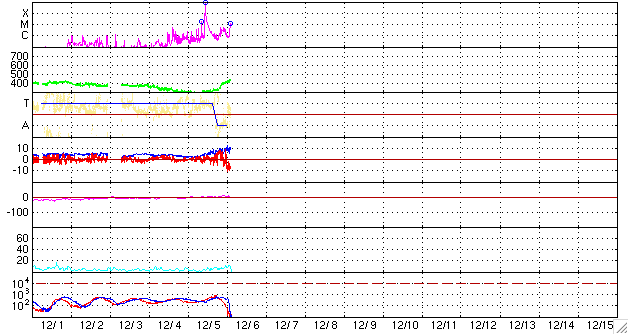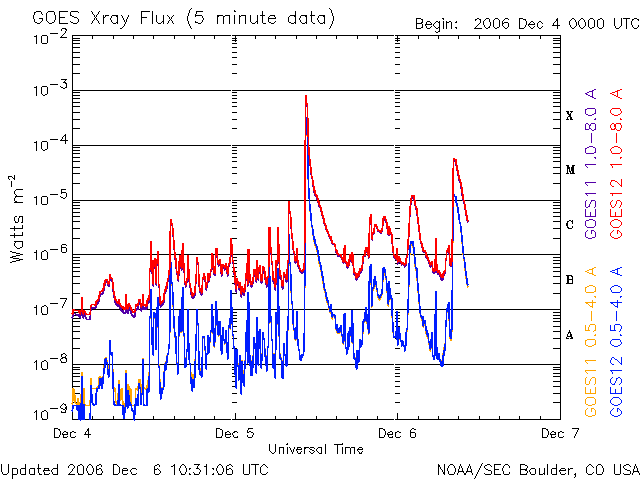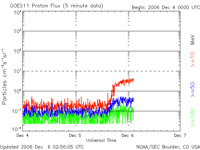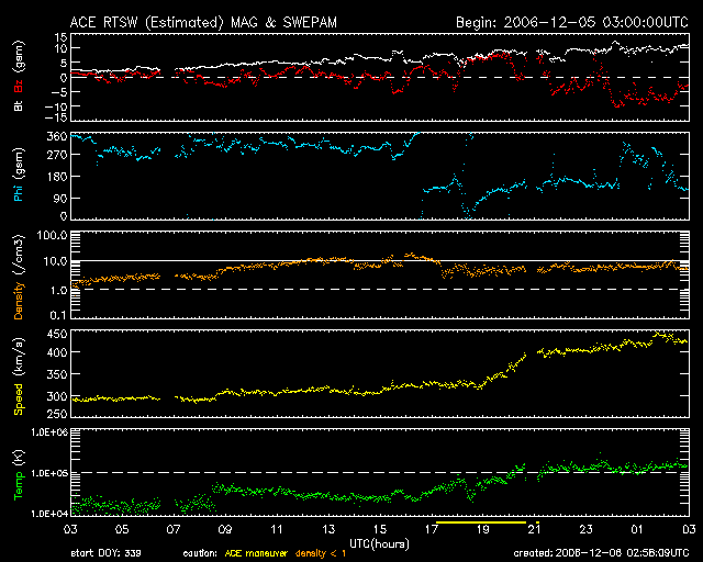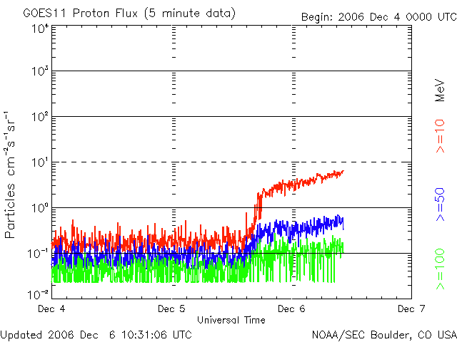 2006/12/ 6 19:34 追加 GOES衛星の太陽X線データ (c) NOAA/SEC ![]() SOHO衛星のMDIカメラによる太陽黒点 (c) SOHO (ESA & NASA) ![]() GOES衛星の太陽放射線データ (c) NOAA/SEC ![]() ACEが観測した太陽風の磁場(1番上の枠、白線は全体の強度、赤線は南北成分) および、太陽風の密度(3番目の橙線)、速度(4番目の黄線) (c) NOAA/SEC ![]() 2006/12/ 7 09:00 追加 GOES衛星の太陽X線データ (c) NOAA/SEC ![]() GOES衛星の太陽放射線データ (c) NOAA/SEC ![]() | |||||||||||||||||||||||||||||||||||||||||||||||||||||||||||
