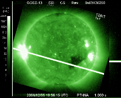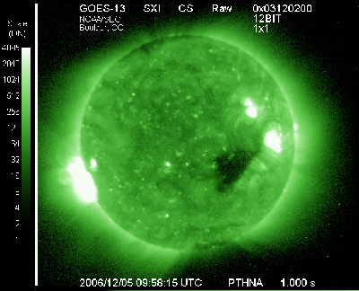 2006/12/ 6 12:00 更新 X9のたいへん大規模なフレアが発生しました。フレア活動は活発に続いています。コロナホールによる高速風が始まりました。 2006/12/ 6 19:34 追加 活発なフレア活動が続いています。17時(世界時8時)にM6の中規模フレアが発生しました。 2006/12/ 7 09:00 追加 [速報] 7日未明に、X6.5の大規模フレアが発生しました。 担当 篠原 昨夜、5日19時半(世界時5日10時半)に、太陽でX9.0の非常に大規模なフレアが発生しました。 Xクラスのフレアは、2005年9月以来の発生です。 過去30年間の観測でも、歴代28位という規模になります。 過去の大きなX線フレア(NICT) 発生箇所は、太陽の東の端(左の端)で、新しい活動領域が上がって来たばかりでした。 929黒点群と名付けられたこの領域が、太陽の向こう側からこちら側に上がって来ると共に、 GOESのX線グラフのレベルが上昇し、 Cクラスの小規模フレアが頻繁に発生しました。 そして、昨夜、5日17時(世界時5日8時)にM1.8の中規模フレアが発生、 続いて5日19時半(世界時5日10時半)に、X9.0の非常に大規模なフレアが発生したのです。 フレアの様子を、GOES13のX線動画でごらん下さい。 今日の1枚目に掲載しています。 たいへん残念なことに、フレア以降、X線の画像に白い横線が残っています。 この白線は今朝の画像でも残っていて、どうやらカメラに障害が残ってしまった様です。 GOES13のX線画像は、これまでのGOES12と比較すると格段に品質が向上していて、 本格稼働が楽しみだっただけに、今後の回復を期待したいところです。 フレア活動は現在も活発に続いています。 ちょうど今、6日10時半(世界時6日1時半)に、M1.3クラスのフレアが発生した様です。 今後も活発な活動が続くと予想されます。 再び、Xクラスの大規模フレアが発生することも十分考えられますので、 注意が必要です。 太陽写真では、東端にかすかに929黒点群の姿を見ることができます。 この黒点群は、先月11月10〜20日にかけて肉眼黒点になっていた923黒点群が、 一回転してきたものではないかと思います。 11月8日の宇宙天気ニュースの太陽写真と、今日の太陽写真(12月5日)を比較してください。 11月8日は12月5日のちょうど27日前です。 ほとんど同じ位置に黒点が見えているのが分かります。 フレアに伴って、太陽放射線(太陽から飛んで来た、非常に高速のプロトン粒子)がいくらか増加しています。 増加は6日0時(世界時5日15時)頃から始まり、現在、4PFU程度です。 衛星への警戒レベルは10PFU以上と言われています。 フレアが太陽の東端で起こったため、太陽放射線は地球へは届きにくい状況にあります。 そのため、フレアがたいへん大規模だったわりに、大きな増加になっていないのです。 太陽放射線は今後もゆっくりと増加を続ける可能性があります。 今後の変化に注目する必要はあるでしょう。 また、これだけの規模のフレアですので、 CME(太陽ガスの放出現象)もかなり激しく発生したと思われます。 状況をSOHO衛星のLASCOカメラで見たいところなのですが、12月4日以降画像の更新が止まっています。 これは事故ではなく、SOHO衛星の運用の関係で、現在データが得にくい状態にあるのです。 EITカメラの更新が軒並み停止しているのもその影響です。 LASCOについては、4日までは更新が続いていたのですが、 それ以降は、更にデータが得にくい状態になっているのかもしれません。 更新が再開されるまで、しばらく待つしかありません。 今回は、CMEの発生箇所が地球から見て真横なので、飛び出したガスも大半は横方向へ飛んでいるはずです。 ですので、地球への影響は、全体として見れば最小限に留まるはずです。 今日の1枚目のフレアの動画を見ていると、フレアの輝きの直後に、 CMEに相当する太陽ガスの噴出が写っているように見えます。 地球へやって来るとすれば、右端に向かって飛び出しているガスになりますが、 フレアの規模が大きかっただけに、こちら側へも十分に飛び出しているように見えます。 恐らく、ある程度の規模の衝撃波はやってくるのではないでしょうか。 今夜から明日いっぱいにかけて、太陽風の変化に注目する必要はあると考えます。 さて、なかなか今日は忙しいです。 太陽風は、コロナホールによる高速風領域に変わりつつあります。 ACEの図を見ると、磁場強度がじわじわと強まって、2nTから10nTへ上昇しています。 速度も既に上がり始めていて、300km/秒から、現在は450km/秒近くに達しています。 磁場強度が強まったままですので、速度の上昇はまだ続くと思われます。 前周期は、最高速度は650km/秒にまで達しました。 今回も、コロナホールは大きな姿をしていますので(今日の2枚目の写真を参照してください)、 同程度の上昇が起こるのではないでしょうか。 明日、明後日にかけて、速度の変化に注意してください。 太陽風磁場の南北成分は、現在南寄りの傾向を強めていて、 -5〜-10nTとやや大きめの南向きになっています。 速度が上昇し始めていることと重なって、活発なオ