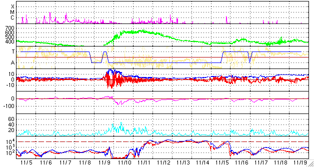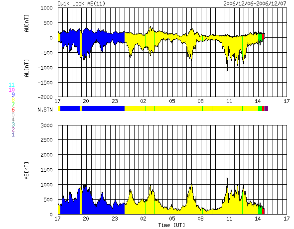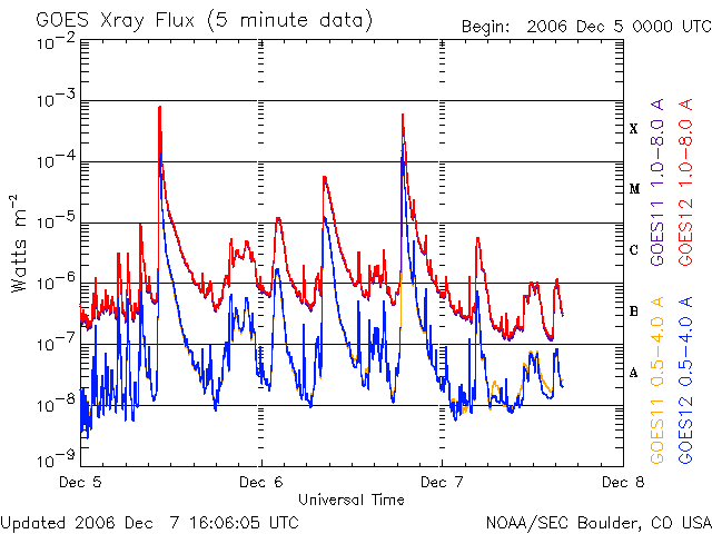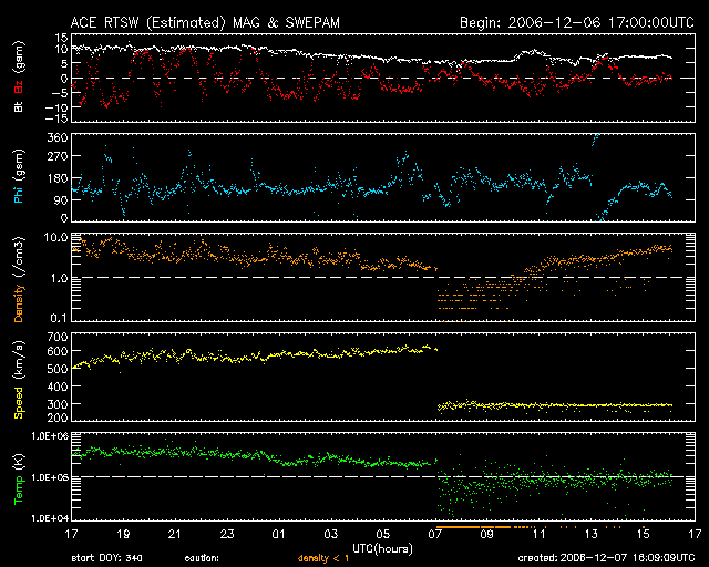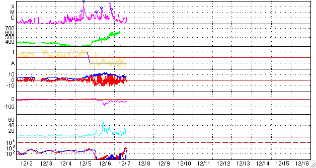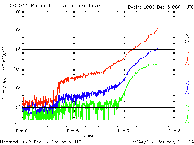 2006/12/ 8 01:06 更新 太陽放射線の強度が1000PFUを超えました。たいへん強まっており、注意が必要です。 担当 篠原 太陽放射線(非常に高速のプロトン粒子)が増加を続けています。 8日1時(世界時7日16時)に、とうとう1000PFUを超えました。 10PFUを超えると衛星に障害が発生しやすくなると言われていますが、それをかなり上回る数値です。 過去11年間の記録では、太陽活動の活発な期間を含めても、 平均で1年に1〜2回しか起こらない、激しいイベントです。 X9に続いて、X6のフレアの影響も加わると考えられるため、 太陽放射線が強まった状態はしばらく続くと思われます。 衛星の運用では注意が必要な状態だと思われます。 今後の変化に注目してください。 その他の宇宙天気データには、目立った動きはありません。 太陽のフレア活動は一休みの状態です。 高速風は続いていて、活発なオーロラ活動を起こし続けています。 詳細は、明日のニュースでお知らせします。 GOES衛星の太陽放射線データ (c) NOAA/SEC ![]() GOES衛星の太陽X線データ (c) NOAA/SEC ![]() ACEが観測した太陽風の磁場(1番上の枠、白線は全体の強度、赤線は南北成分) および、太陽風の密度(3番目の橙線)、速度(4番目の黄線) (c) NOAA/SEC ![]() リアルタイムAE指数 下段のAEグラフの値が高くなると、オーロラ活動が活発化しています。 (c) 京都大学, NICT ![]() 27日の太陽周期に合わせたデータプロット 太陽が同じ面を地球に向けていた27日前の変化から、今後を予想することができます。 (c) NICT