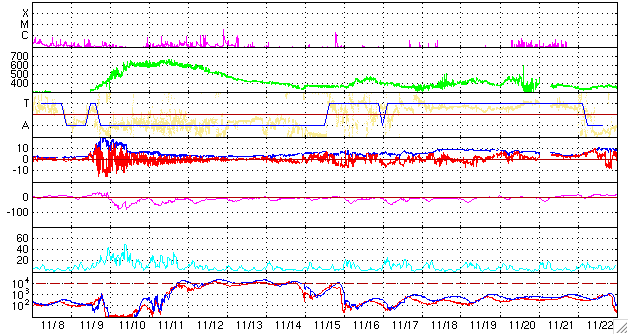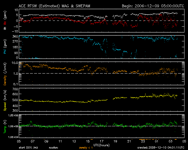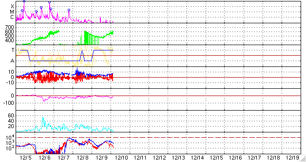 2006/12/10 13:02 更新 930黒点群の活動は穏やかになりました。太陽風の速度が再上昇して(580km/秒)、オーロラが活動的になっています。 担当 篠原 2つの大規模フレアを発生させた930黒点群は、勢力を弱めています。 蓄えているエネルギーの目安となる磁場構造の複雑さはかなり弱まり、 大きなフレアを起こす可能性は小さくなっています。 昨日は、9日20時(世界時9日11時)にC1.3の小さめの小規模フレアを起こしただけです。 今後は、小規模フレアに対する注意というレベルでしょう。 フレア活動は弱まりましたが、黒点としての大きさはなかなかのものです。 先ほど見て来たのですが、肉眼でも見つけることができました。 太陽を観測する場合は、太陽向けの適切なフィルタ−を使用したり(赤外線を透過する危険があります)、 日没直前の十分暗くなった時に行うなど、注意をお願いします。 太陽放射線も次第に弱まっています。 現在は、120PFUレベルに下がっています。 警戒の目安は10PFUとなっていますので、依然注意すべきレベルです。 今後も、引き続き下がり続けて行くでしょう。 太陽風は、500km/秒から580km/秒への緩やかな上昇が見られています。 再び、高速状態が強まっています。 続発したCME(太陽ガスの放出現象)の影響がやってきたのではないでしょうか。 磁場強度は5nT前後で大きな変化はありません。 ただし、南北成分を見ると、速度の上昇以降、南北に頻繁に振れるようになっています。 -5nTくらいの南向きが発生するようになっていて、 速度が高まっていることと重なって、活発なオーロラ活動が発生しています。 AE指数は止まっていますが、シベリアの磁場データを見ると、 オーロラ活動にともなう磁場の変動が記録されています。 シベリアの図は3日幅ですので、右側の3分の1がこの24時間の変動です。 前半の2日にくらべるとやや小さくなりますが、振幅的には中規模の活動です。 高速風は、一時的な増加で、 今日いっぱいくらいで下がり始めるのではないかと思います。 それまでは、活発なオーロラ活動が期待できます。 放射線帯の高エネルギー電子は、減少の傾向になっています。 昨日よりも一段下がっています。 当面、増加することはなさそうです。 SOHO衛星のMDIカメラによる太陽黒点 (c) SOHO (ESA & NASA) ![]() GOES衛星の太陽X線データ (c) NOAA/SEC ![]() GOES衛星の太陽放射線データ (c) NOAA/SEC ![]() ACEが観測した太陽風の磁場(1番上の枠、白線は全体の強度、赤線は南北成分) および、太陽風の密度(3番目の橙線)、速度(4番目の黄線) (c) NOAA/SEC ![]() リアルタイムAE指数 下段のAEグラフの値が高くなると、オーロラ活動が活発化しています。 (c) 京都大学, NICT ![]() シベリアで観測された3日間の磁場データ 右側の3分の1が、昨日のデータになります。グラフが上がったり下がったりすると、オーロラ活動が活発化しています。 (c) NICT ![]() 27日の太陽周期に合わせたデータプロット 太陽が同じ面を地球に向けていた27日前の変化から、今後を予想することができます。 (c) NICT